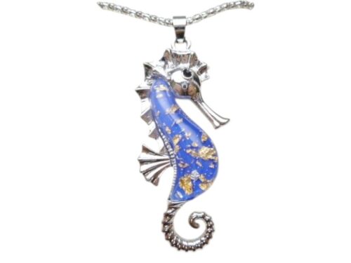 Marble Dark Blue Big Glass Seahorse w/ Chain Necklace 18″