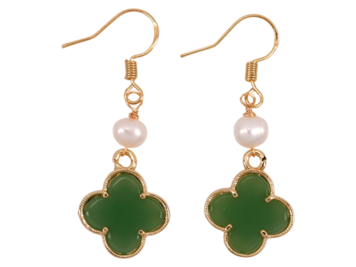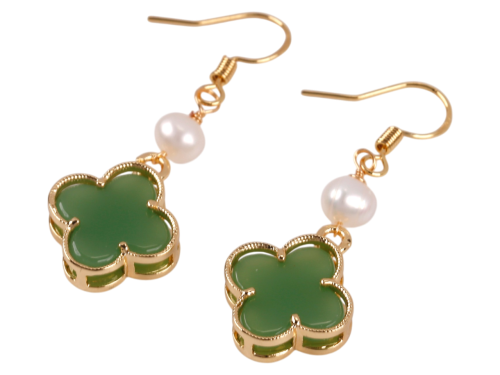 Jade Clover on Fresh Water Pearl and Gold Tone Earrings, MOQ-6