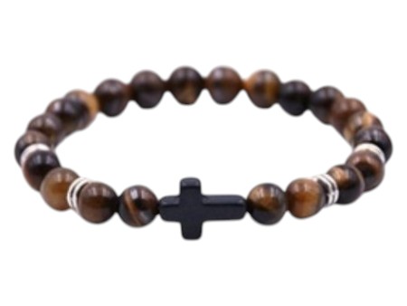 8mm Tiger Eye Stone Bracelet w/ Onyx Cross Charm