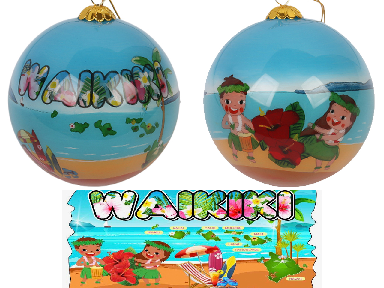 Hand Painted “Waikiki” Beach Scene Hula Dancer Ornament, 54/case