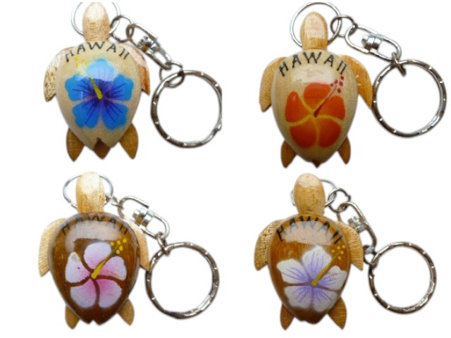 “Hawaii” 2″ Assorted Wood Turtle w/ Painted Plumeria Keychain