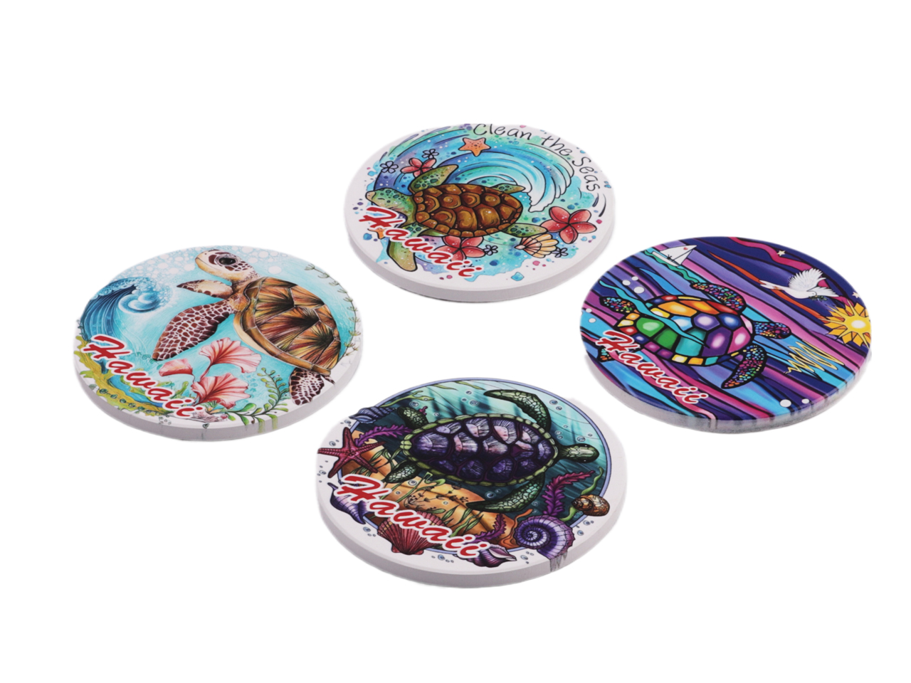 “Hawaii” Round Assorted Turtle Print Ceramic Coaster, 4pcs/set