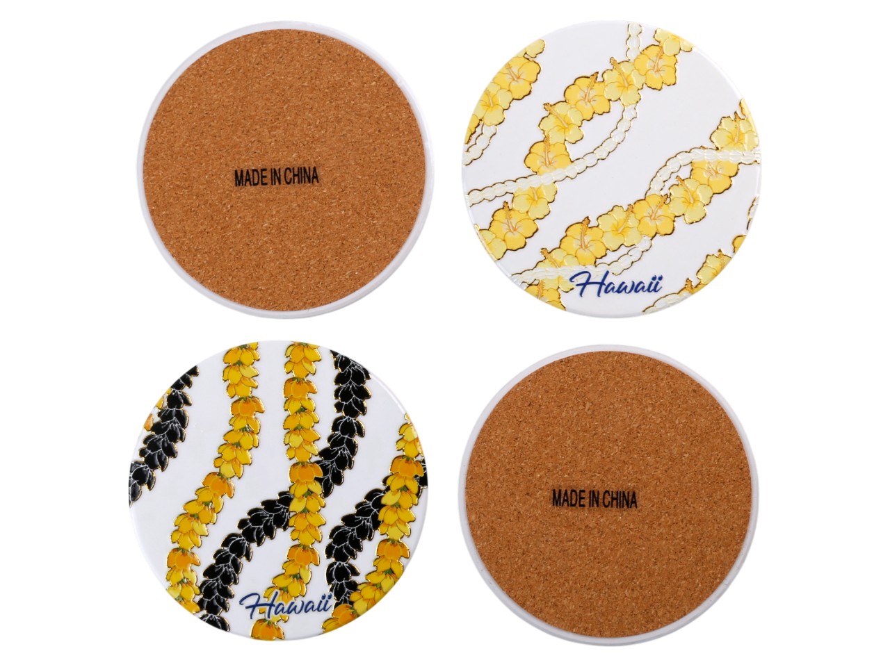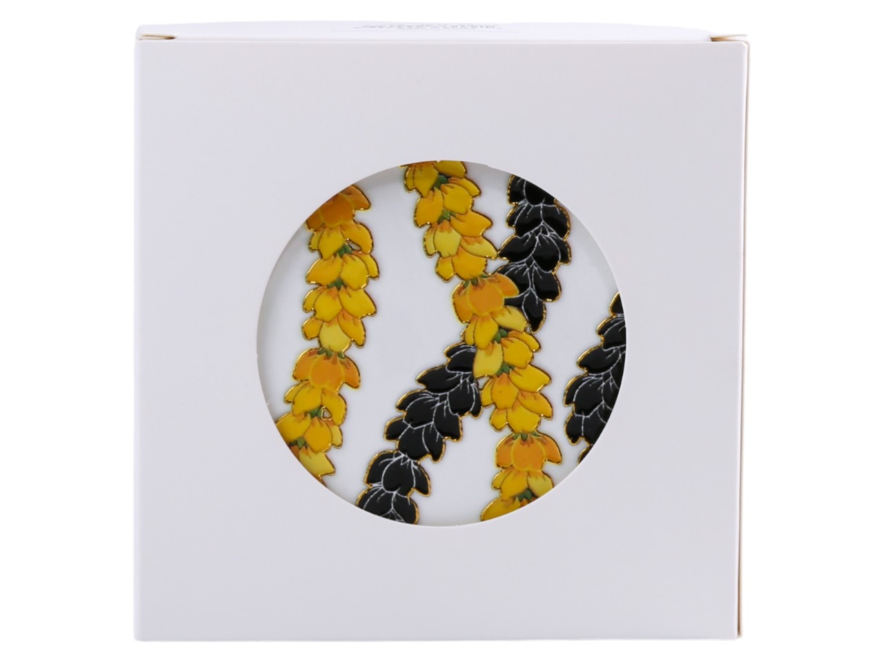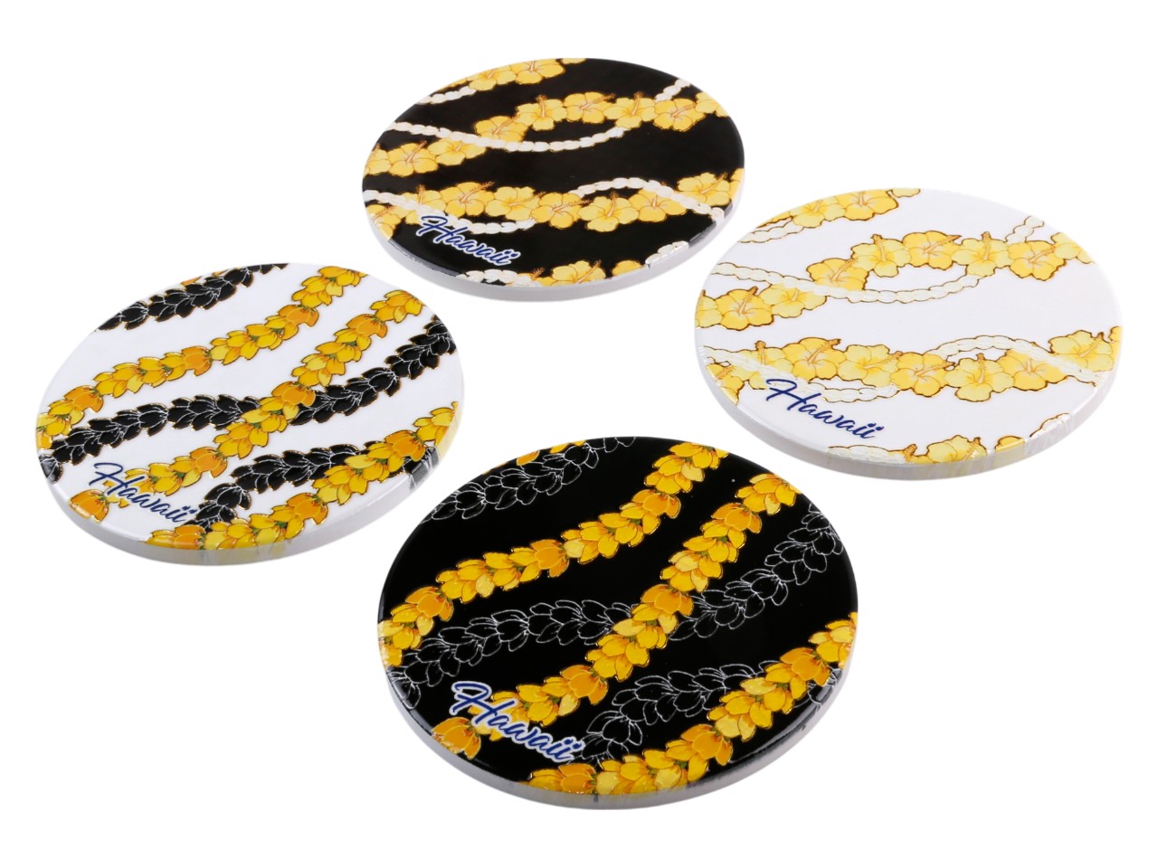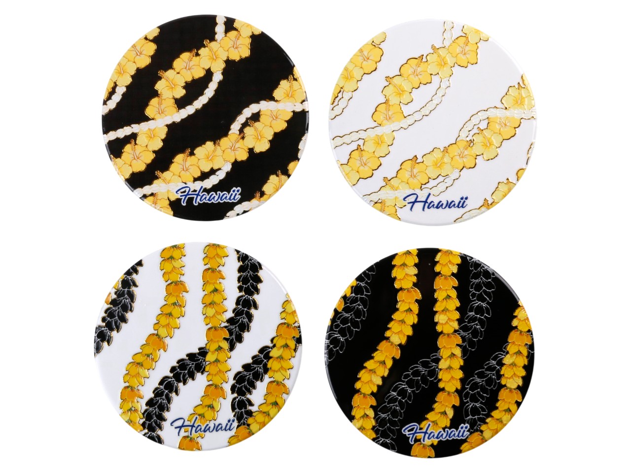 “Hawaii” Yellow Pikake Black Background Ceramic Coaster, 4pcs/set, MOQ-12pcs/3 sets