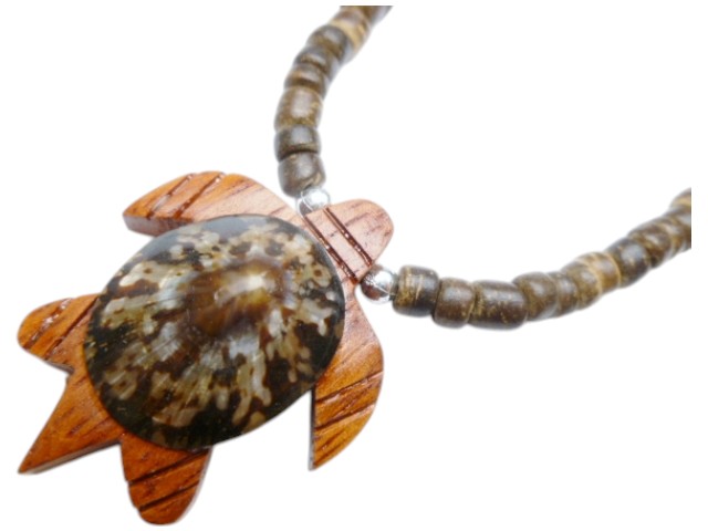 Wood Turtle & Shell w/ 18″ Coconut & Wood Beads Necklace