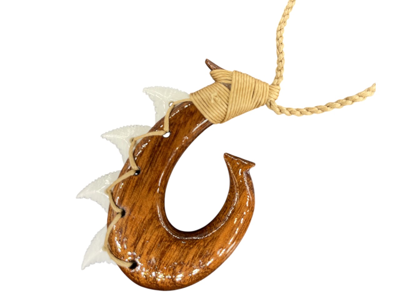 Koa Wood Fish Hook w/ Bone Made Shark Teeth Pendant on Brown Hemp Cord