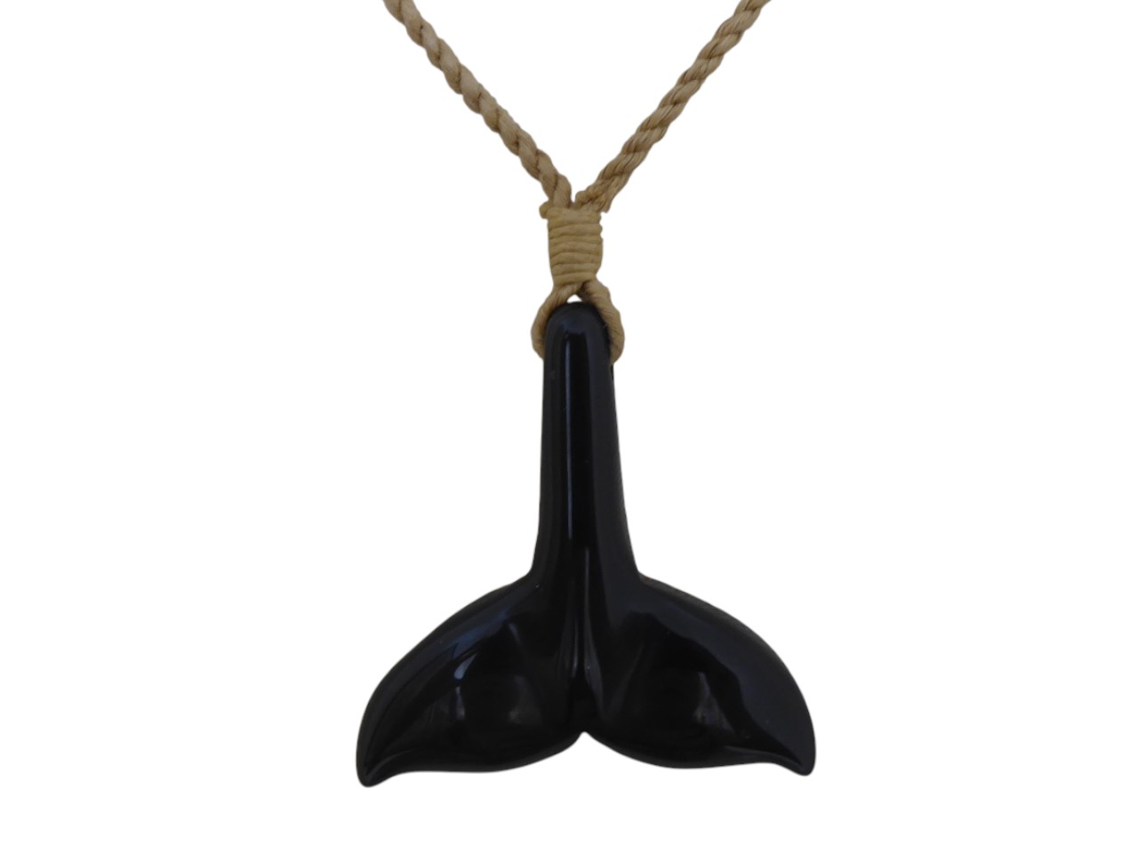 Black Jade Carved Whale Tail on Adjustable Hemp Cord 35x38mm