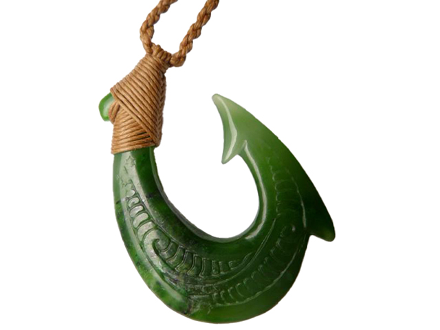Green Jade Carved Tribal Fishhook on Hemp Cord 35x48mm
