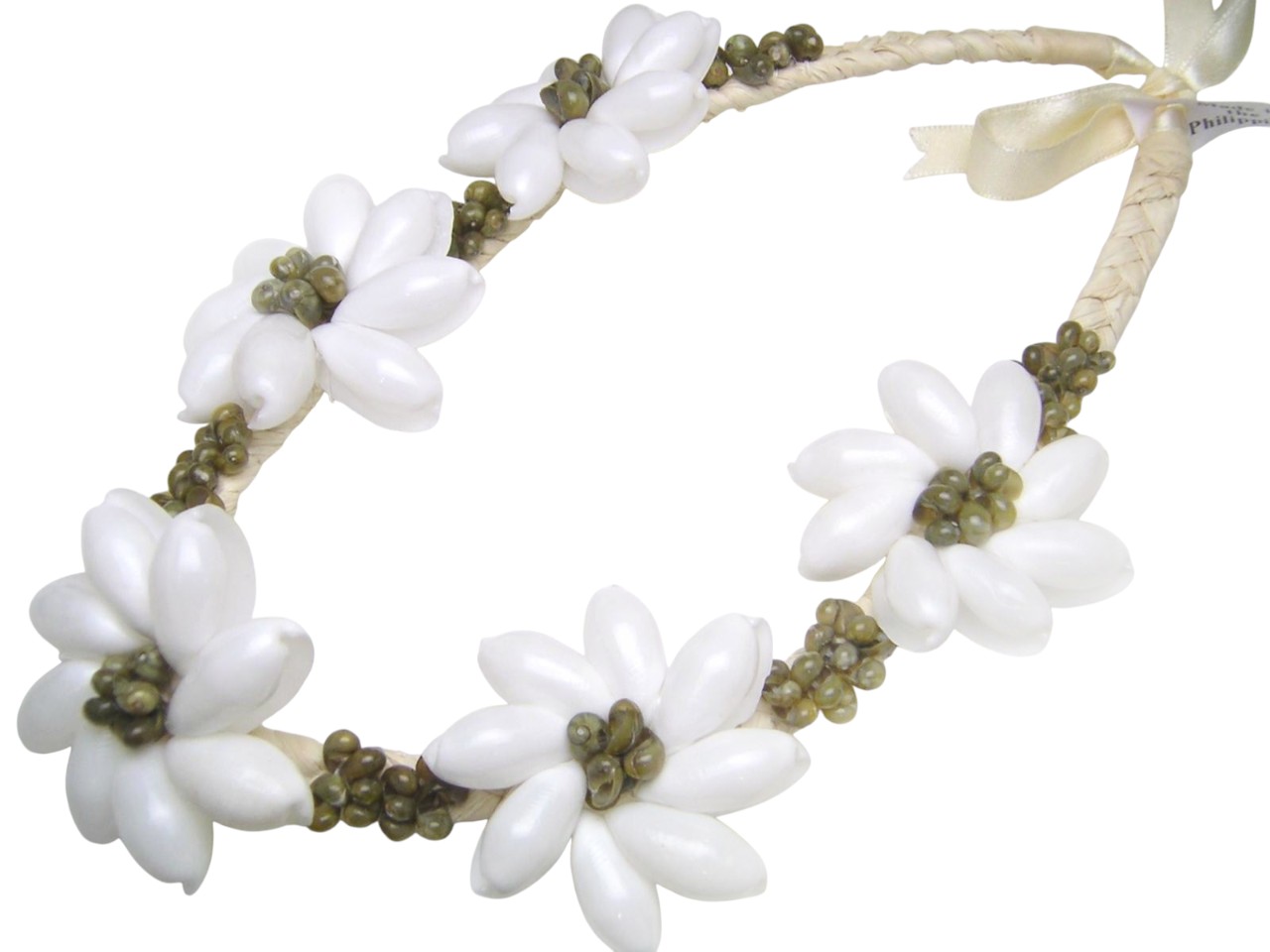 White bubble shell with green mongo shell raffia necklace