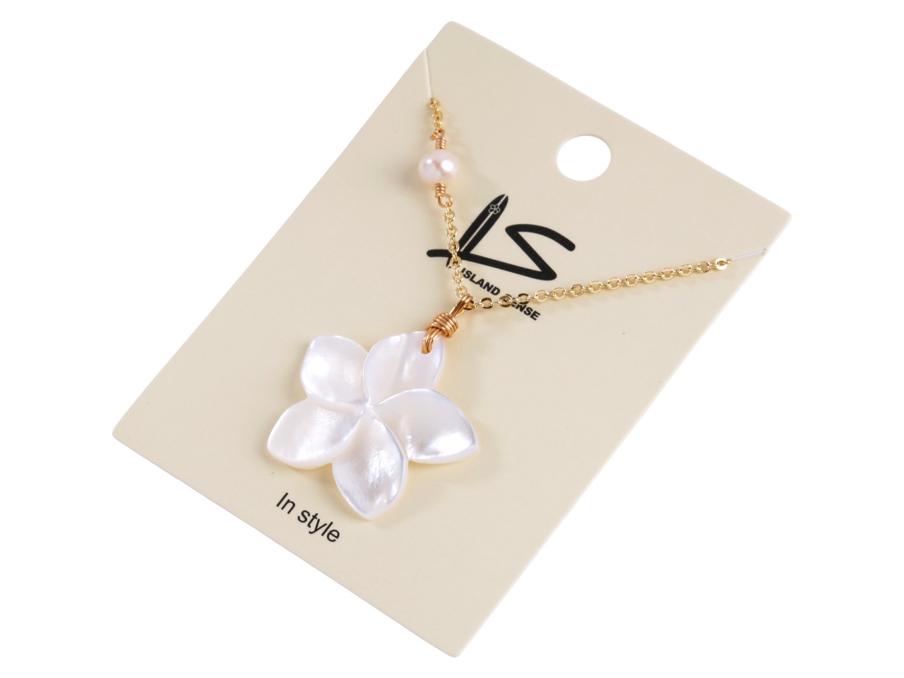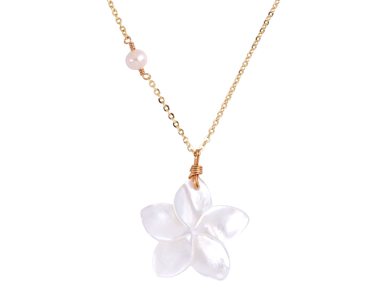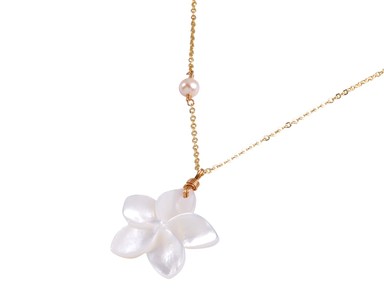 25x3mm MOP Plumeria Pendant on Gold Tone w/ FWP Necklace 16+2″, MOQ-6/Bag