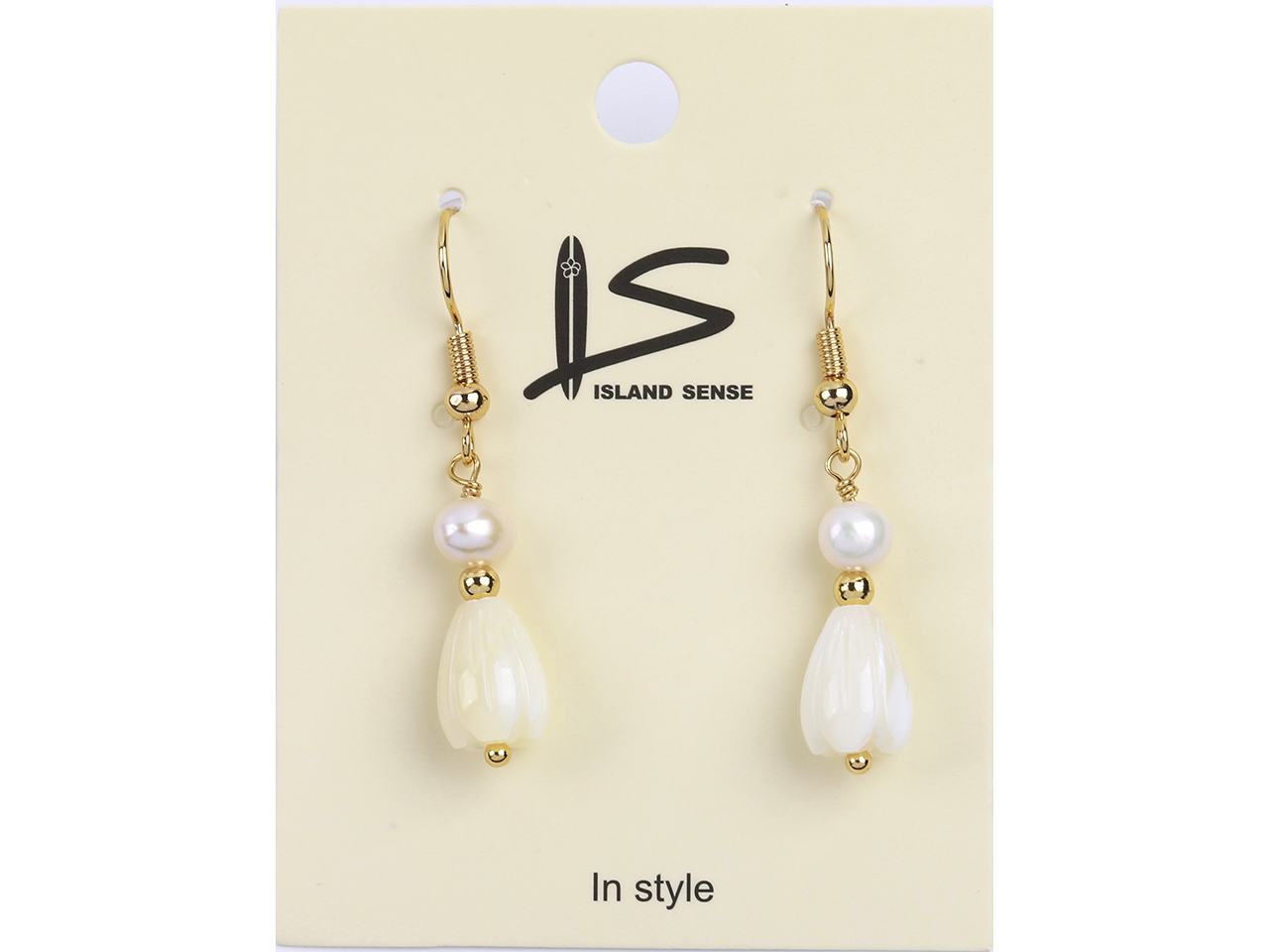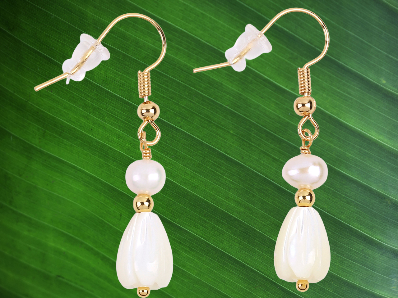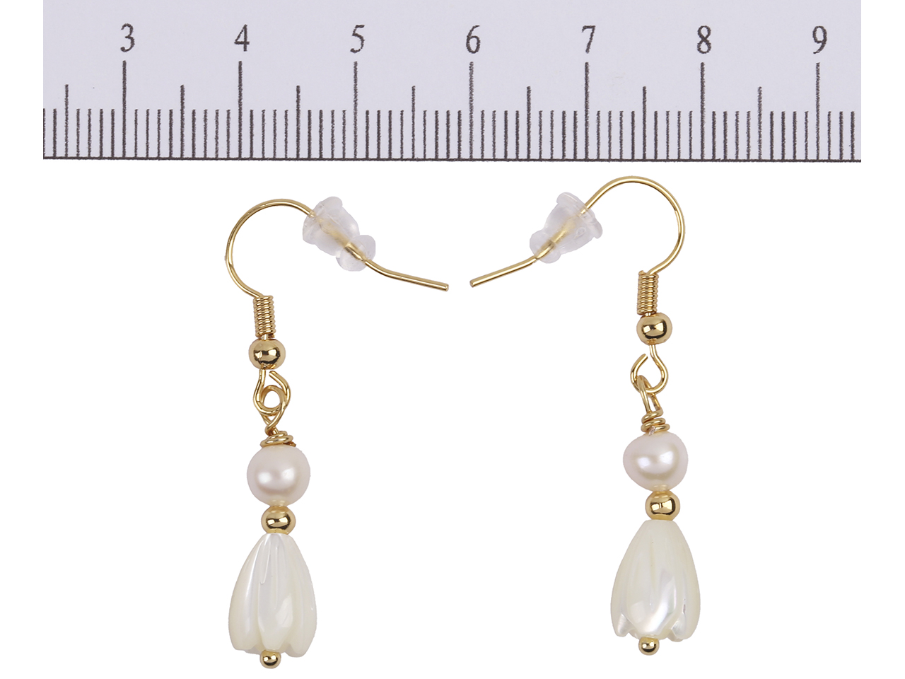 8x11mm MOP Shell Pikake Flower w/ Fresh Water Pearl on Gold Tone Hook Earrings 24x8mm, MOQ-6