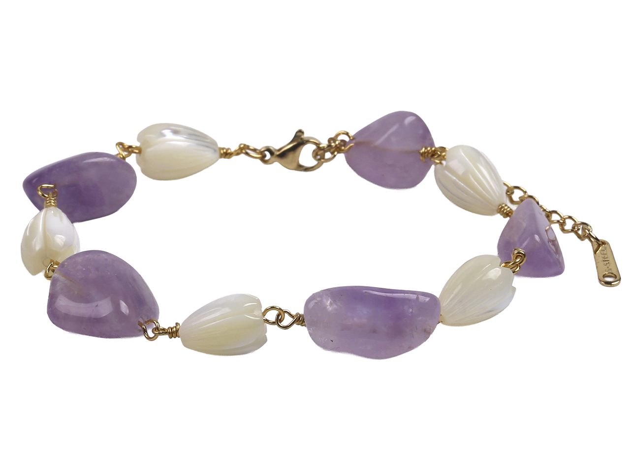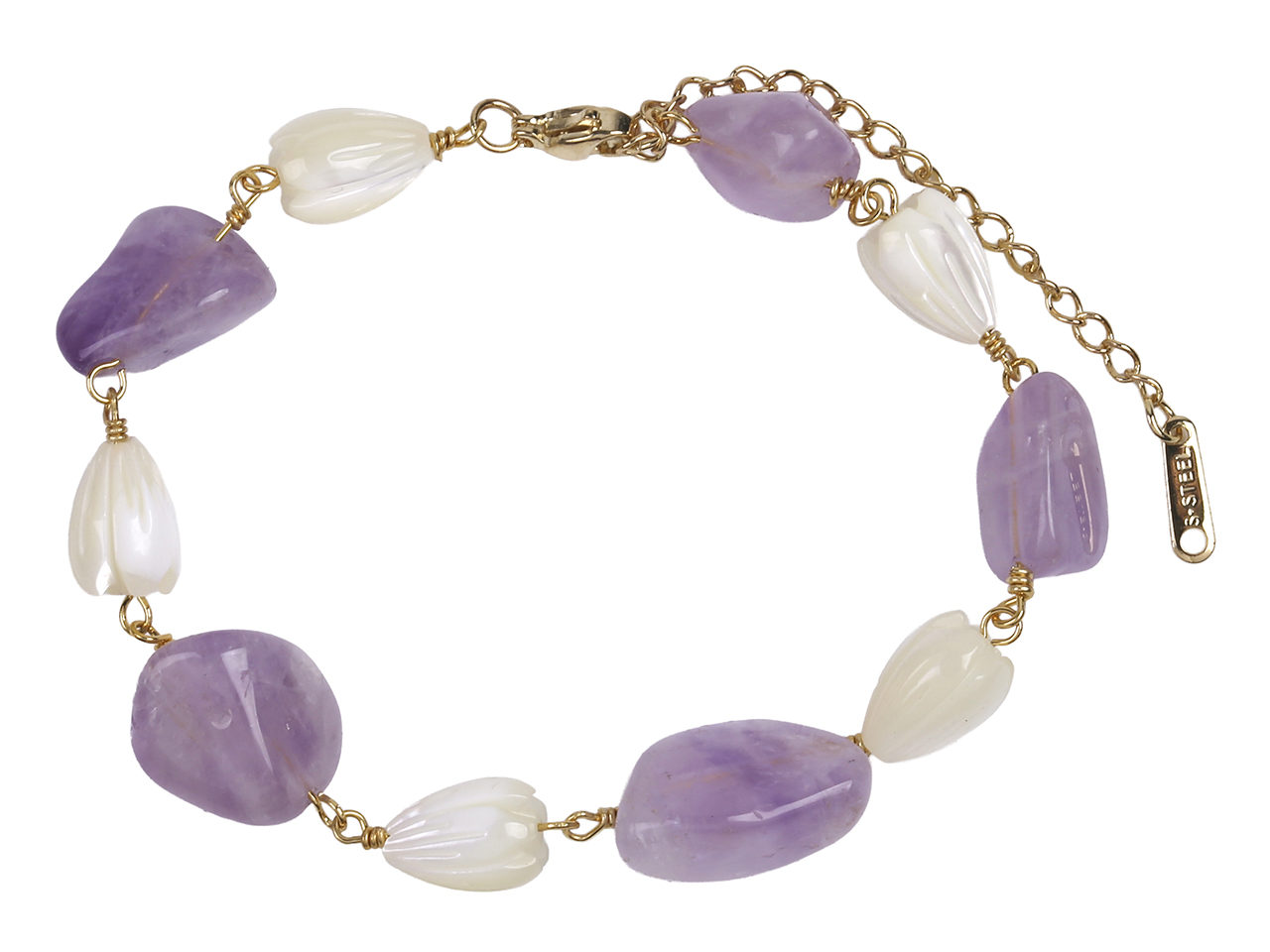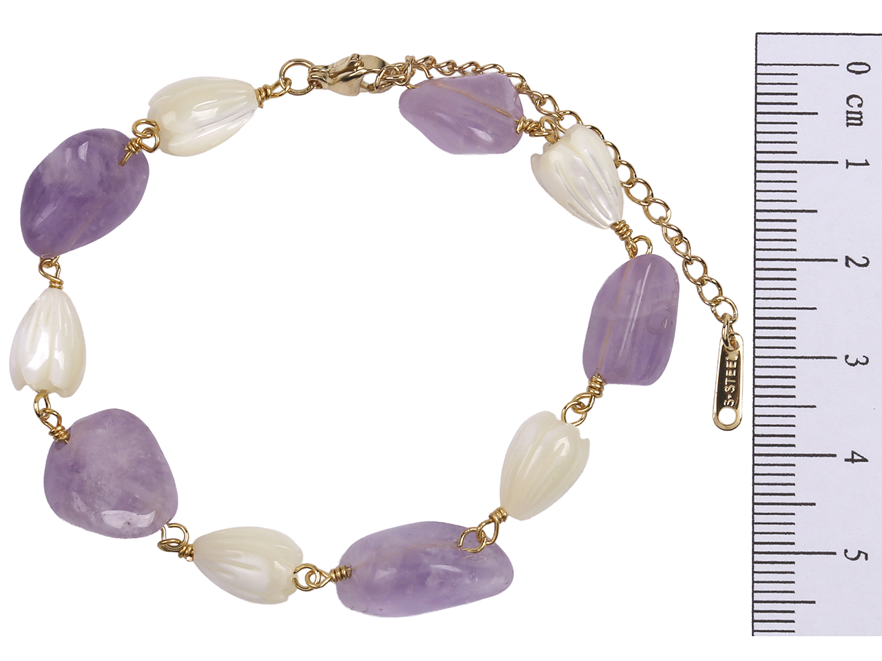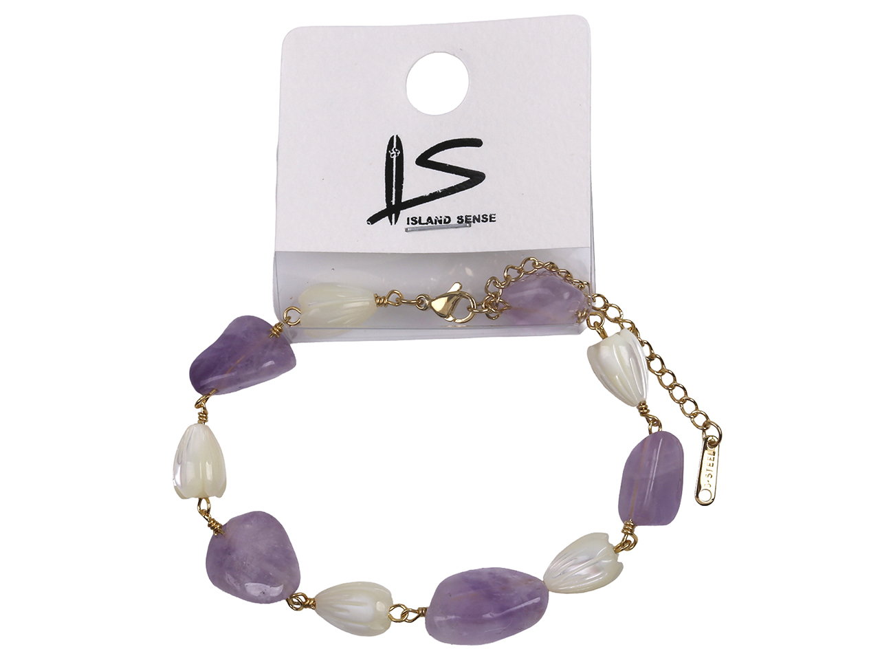 8x10mm MOP Shell Pikake Flower w/ Amethyst Nuggets on Gold Tone Chain Bracelet, MOQ-6/Bag