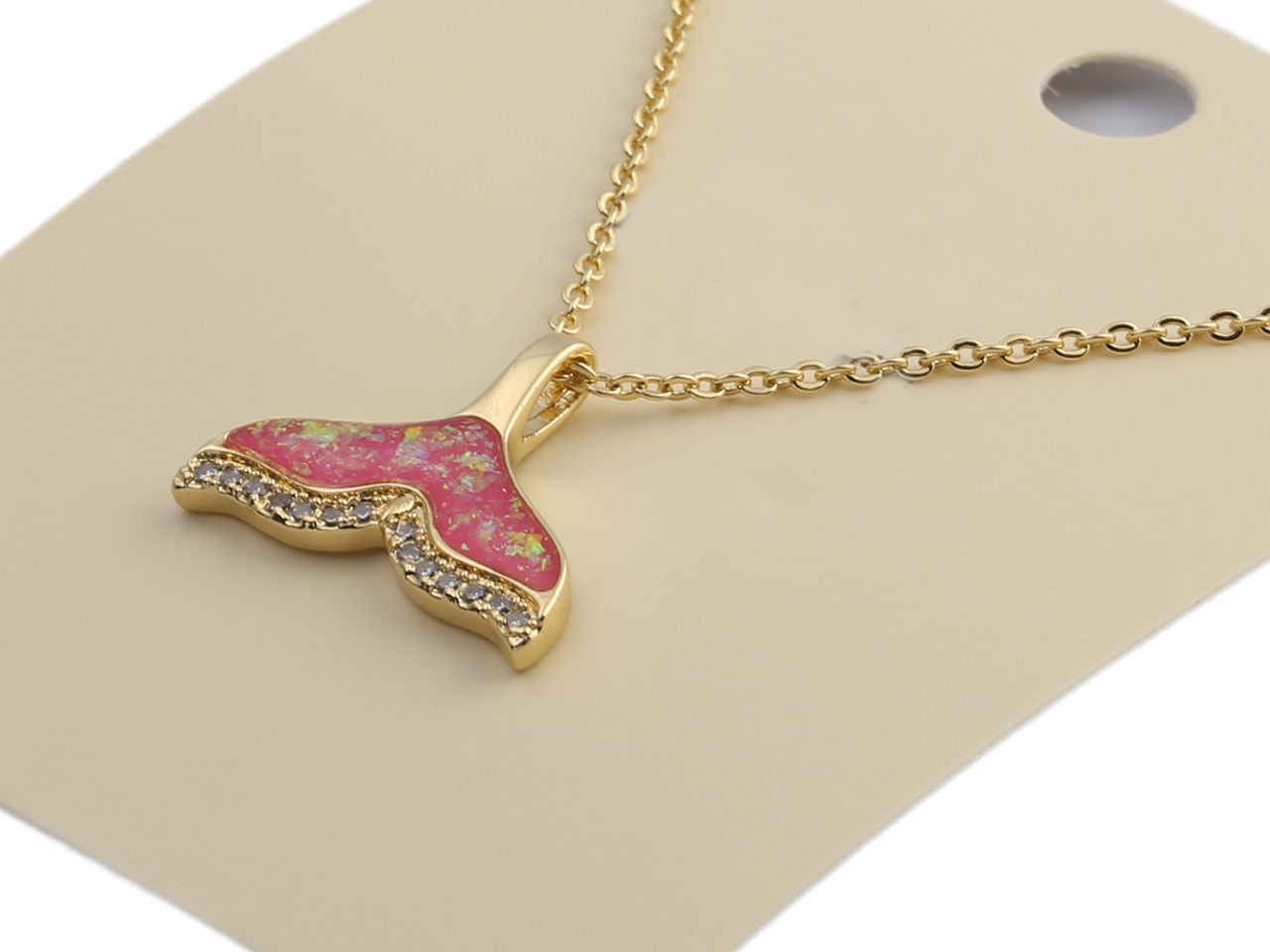 18x20mm Pink Synthetic Opal Whale Tail w/ CZ on 18″ Gold Tone Chain, MOQ-6