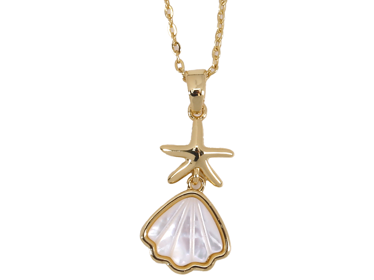 Crystal MOP Sea Shell w/ Starfish Pendant on Gold Tone 16+2″ Chain Necklace, MOQ-6