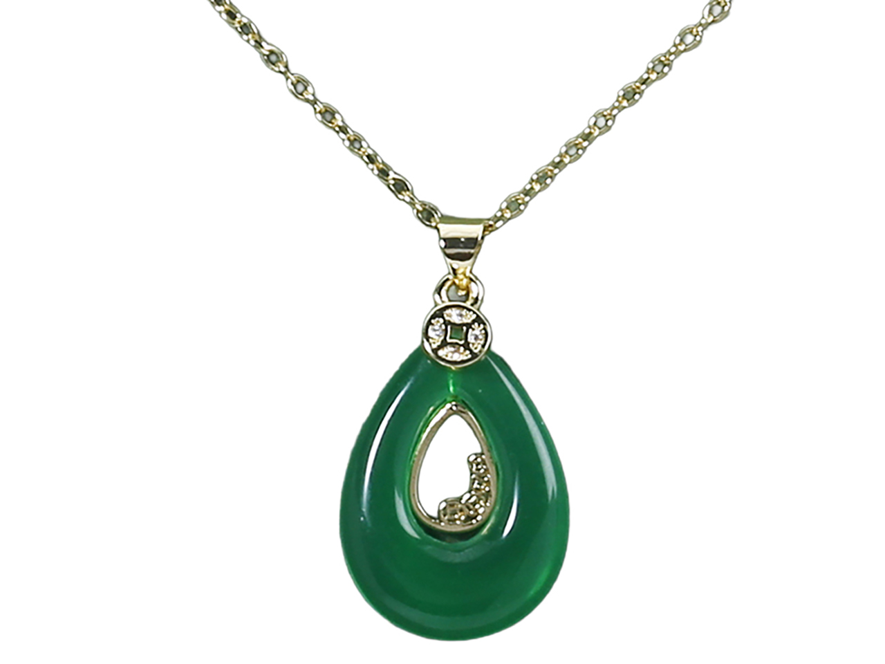 CZ Flower w/ Tear Drop Enhanced Jade Pendant on Gold Tone Chain 16+2″ Necklace, 6/Bag