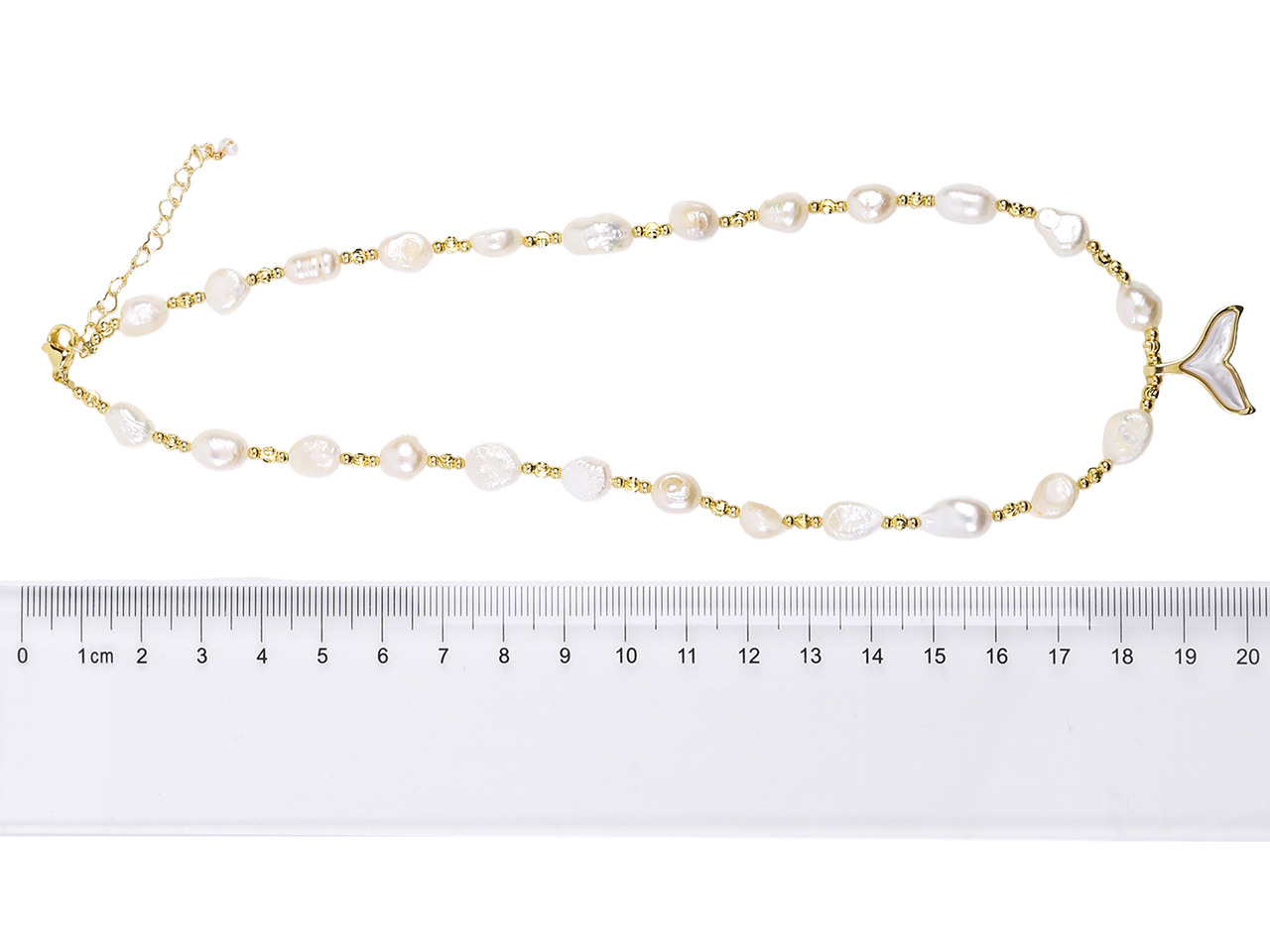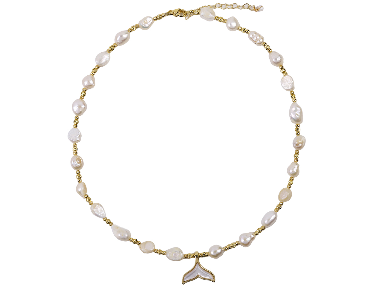 MOP Whale Tail Pendant on Fresh Water Pearl & Gold Tone Beads Necklace 16″+2″ ext., MOQ-2