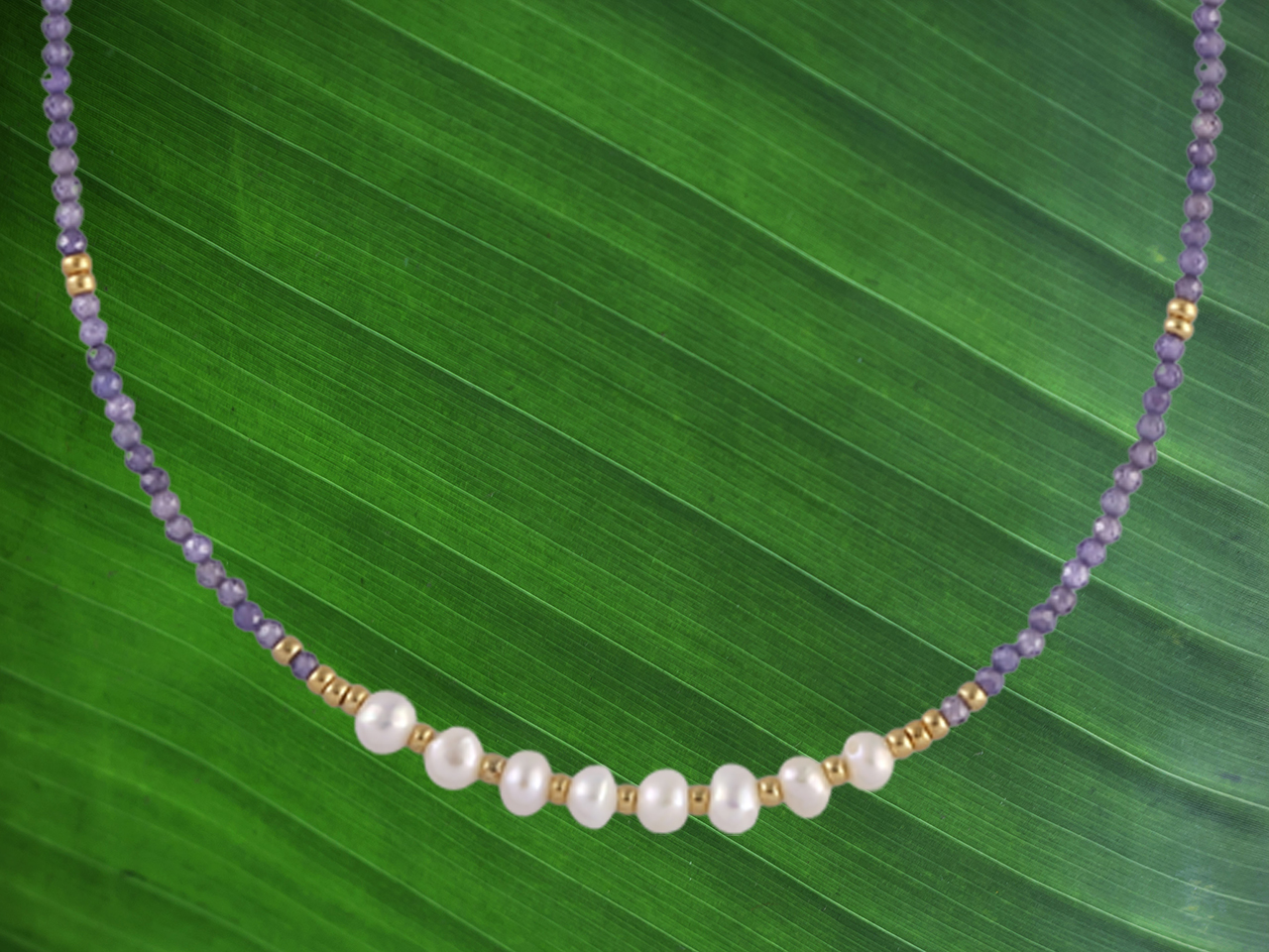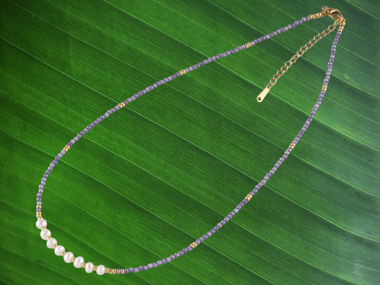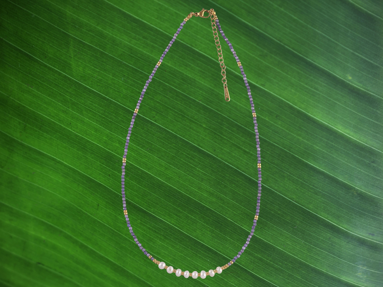 White Fresh Water Pearls on Amethyst Stone & Gold Tone Beads Necklace 16″+2″, MOQ-6