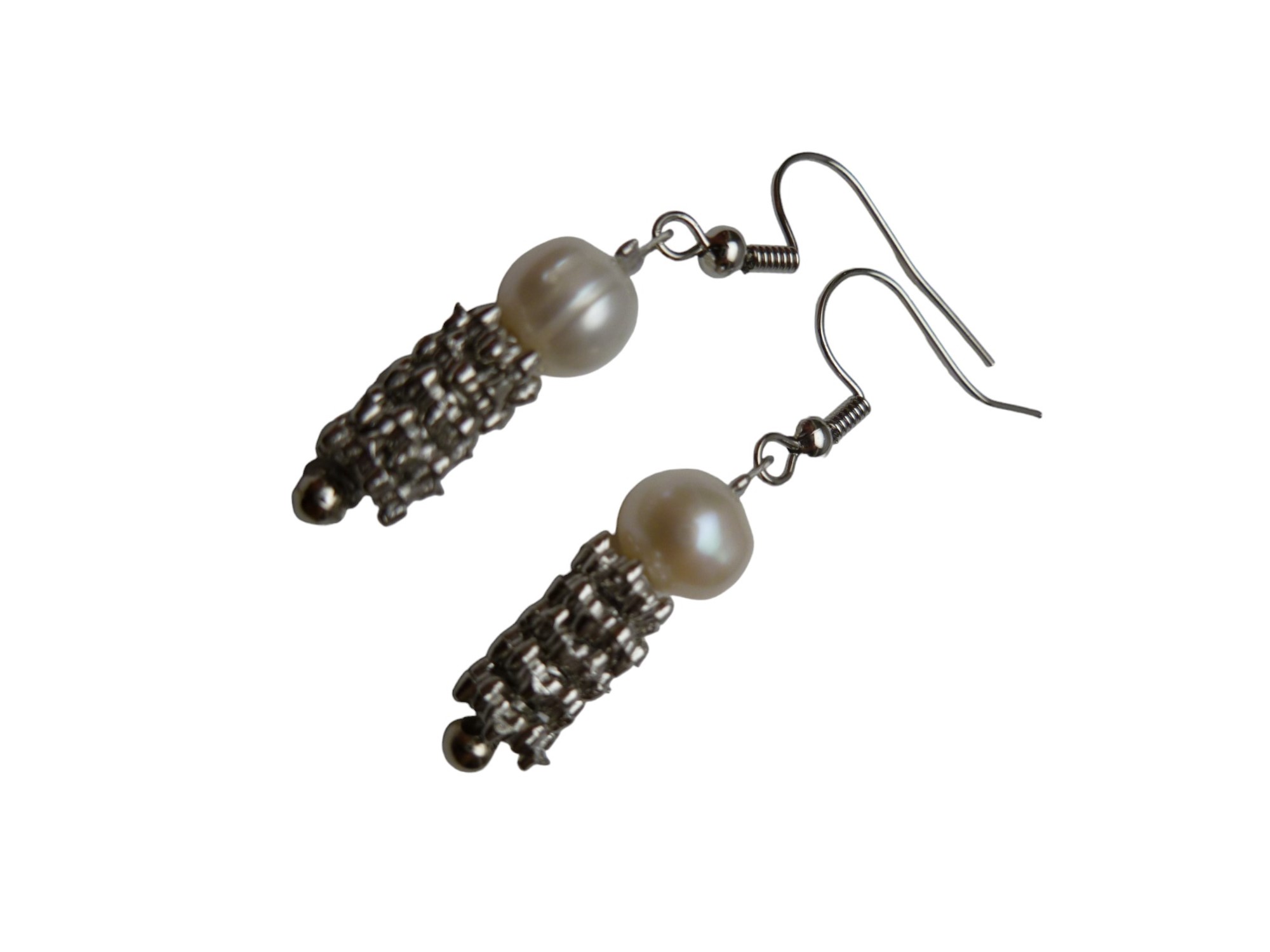 7mm White Potato Fresh Water Pearl with metal spacer Dangling Earring