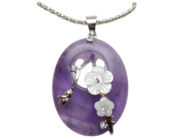 35x45mm Amethyst Stone Pendant w/ MOP Flower on Chain