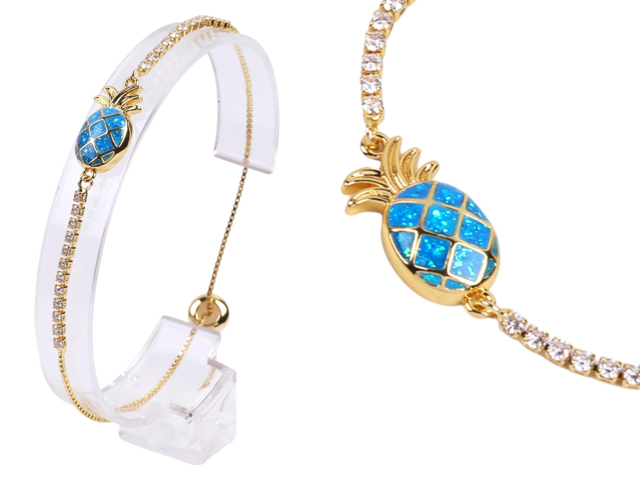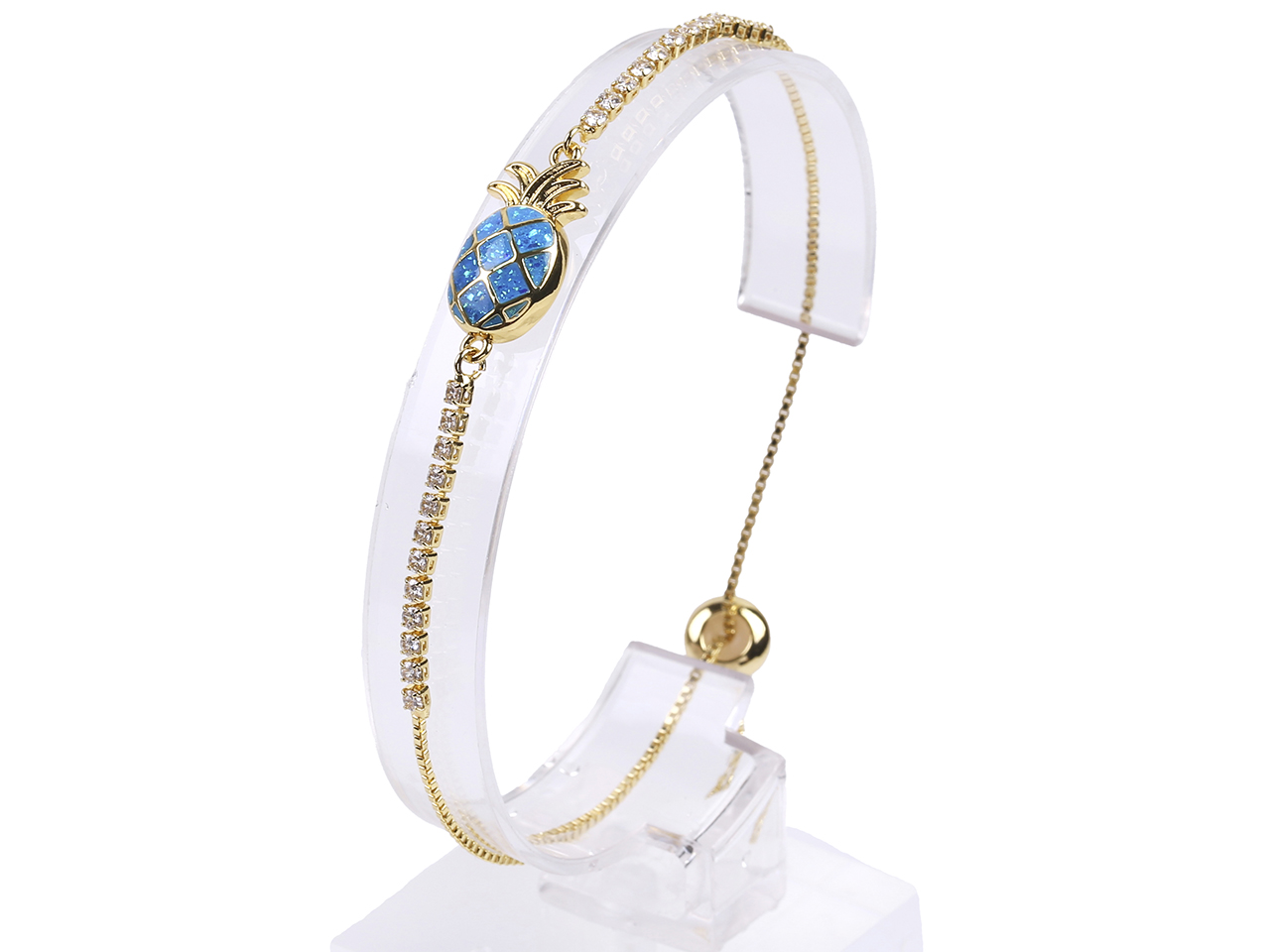 10.5x20mm Blue Synthetic Opal Pineapple CZ Bolo Gold Tone Chain Adjustable Bracelet, MOQ-6