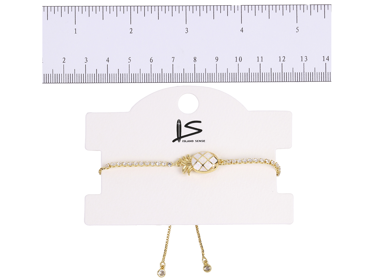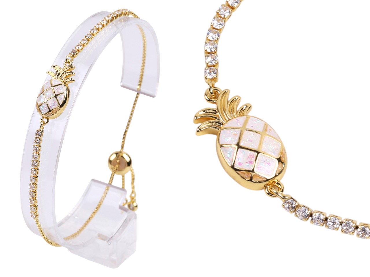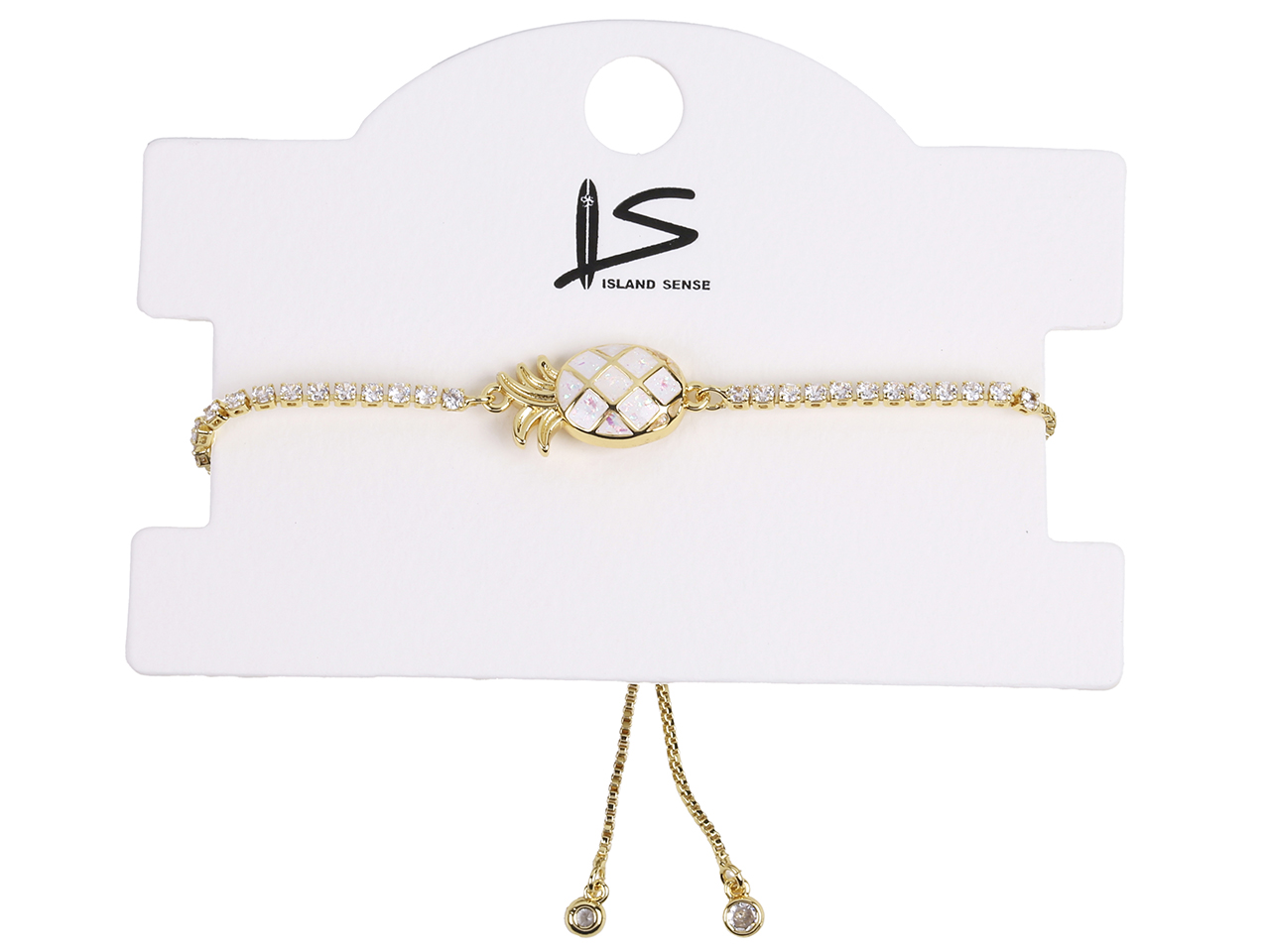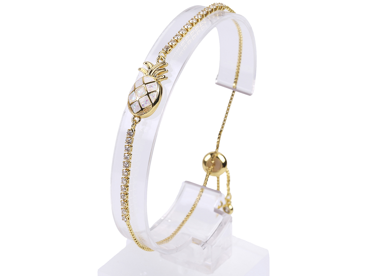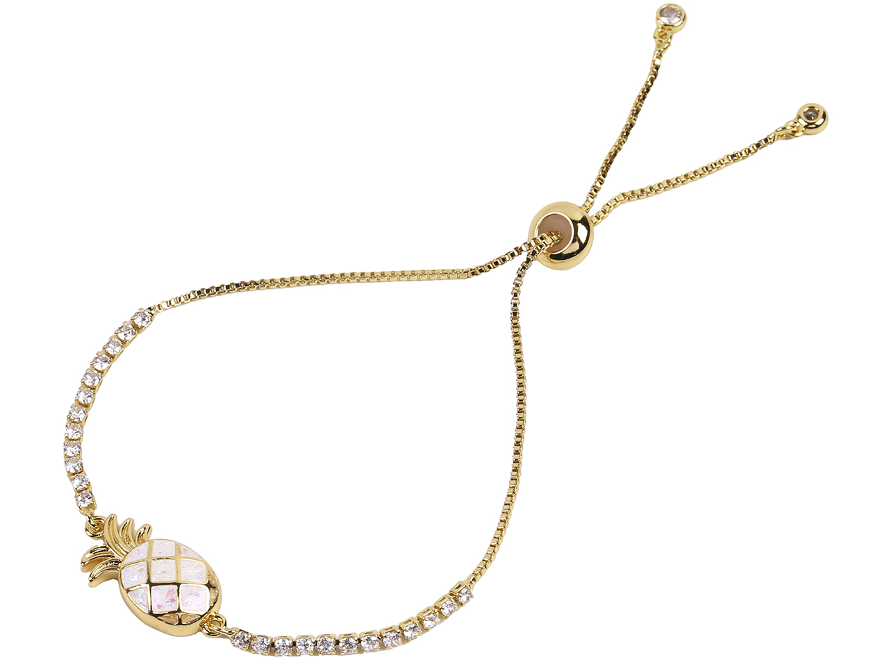 10.5x20mm White Synthetic Opal Pineapple CZ Bolo Gold Tone Chain Adjustable Bracelet, MOQ-6