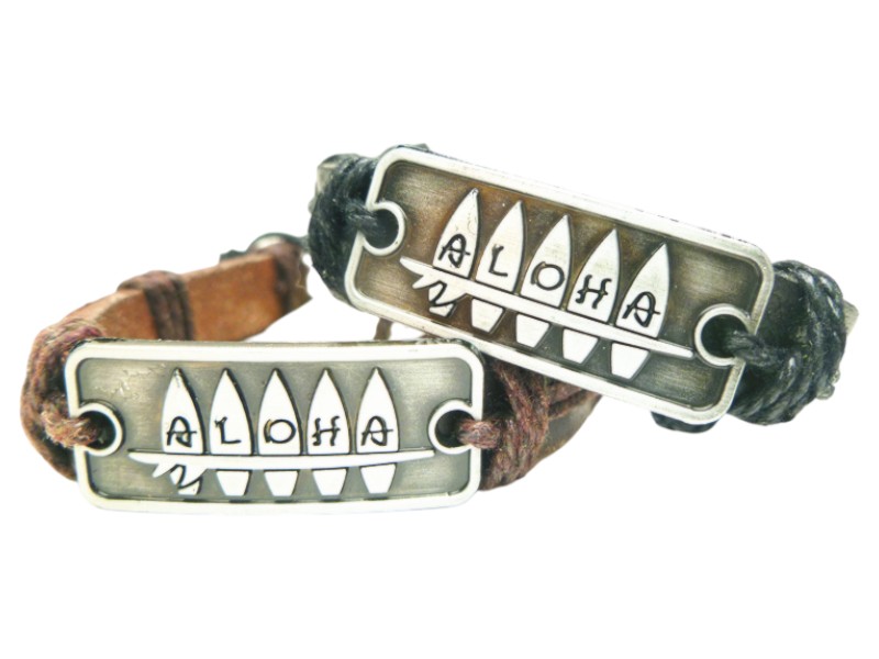“Aloha” Surfboard Metal Plaque Genuine Leather ID Bracelet