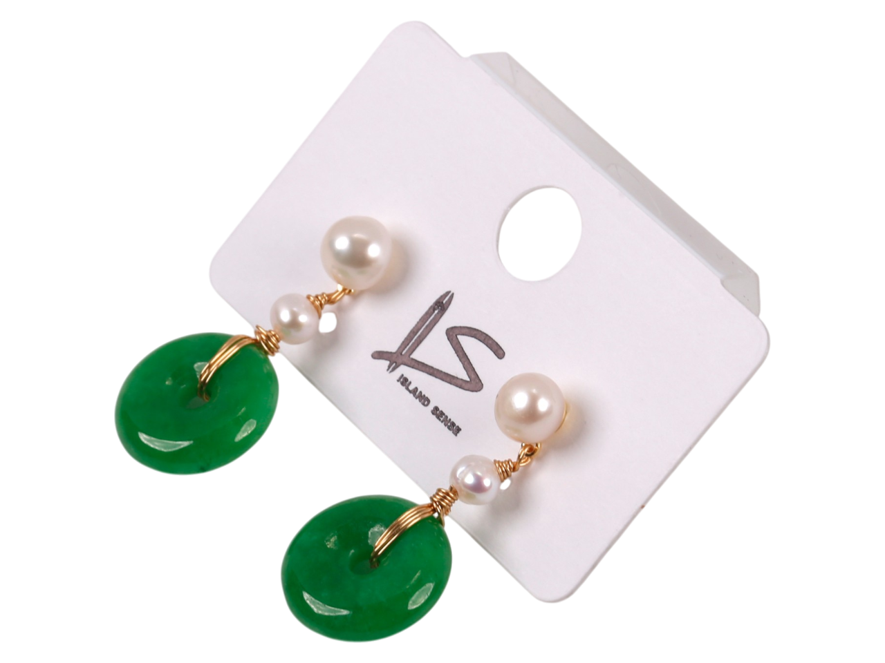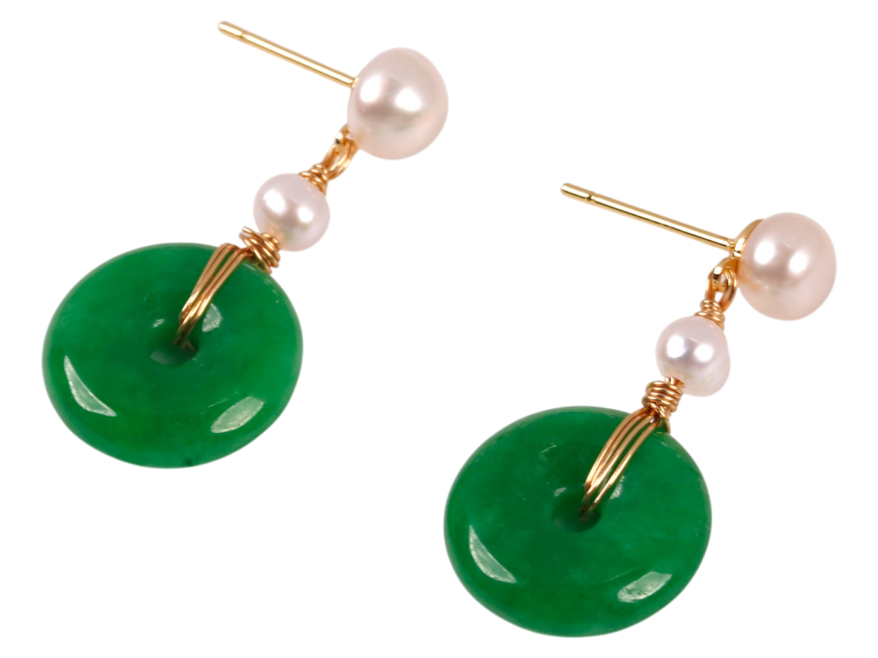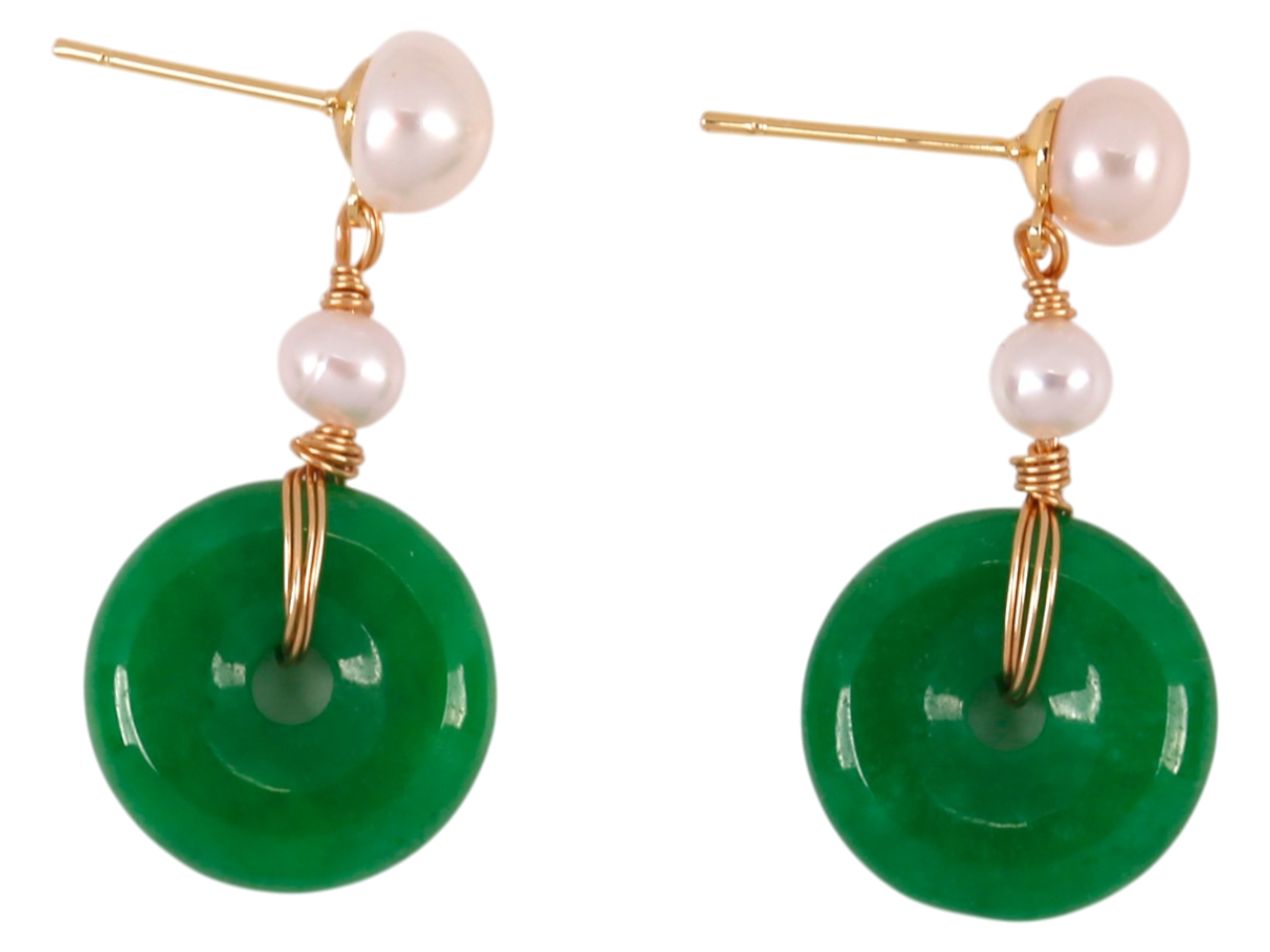 Jade Donut on Fresh Water Pearl on Gold Tone Earrings, MOQ-6