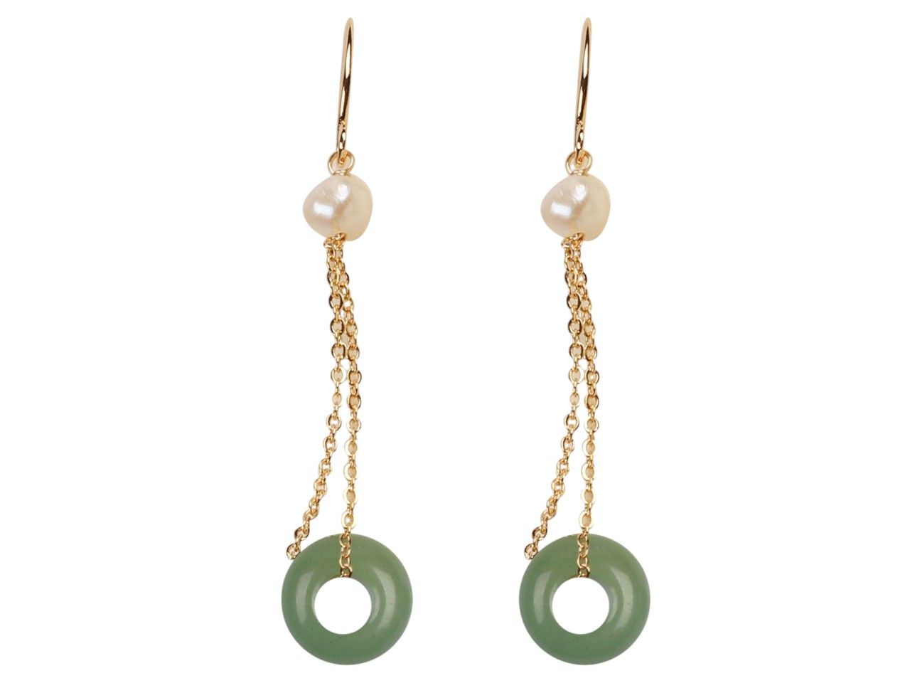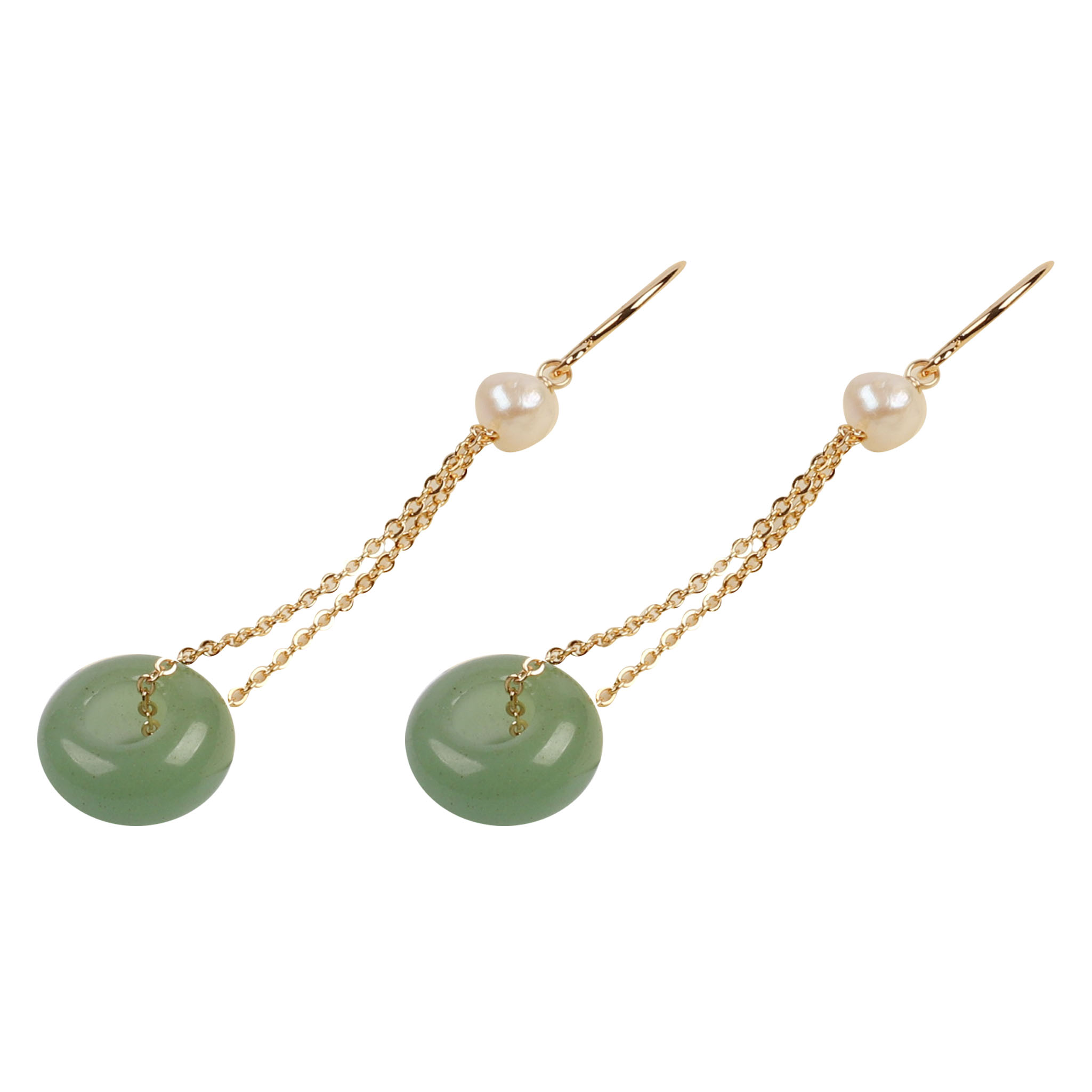 Round Jade on Chain w/ Fresh Water Pearl Gold Tone Earrings