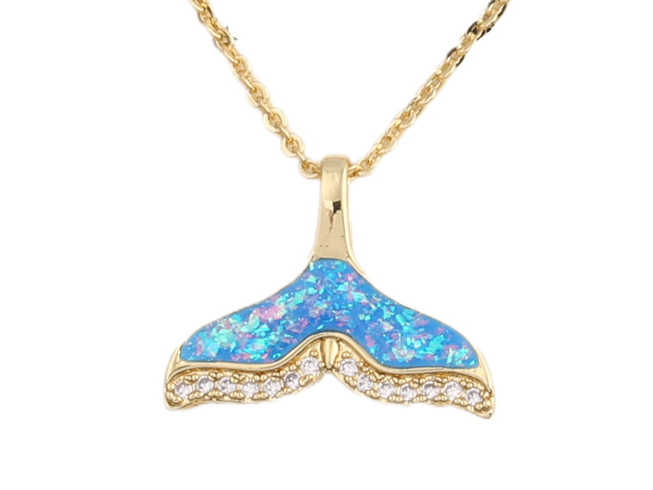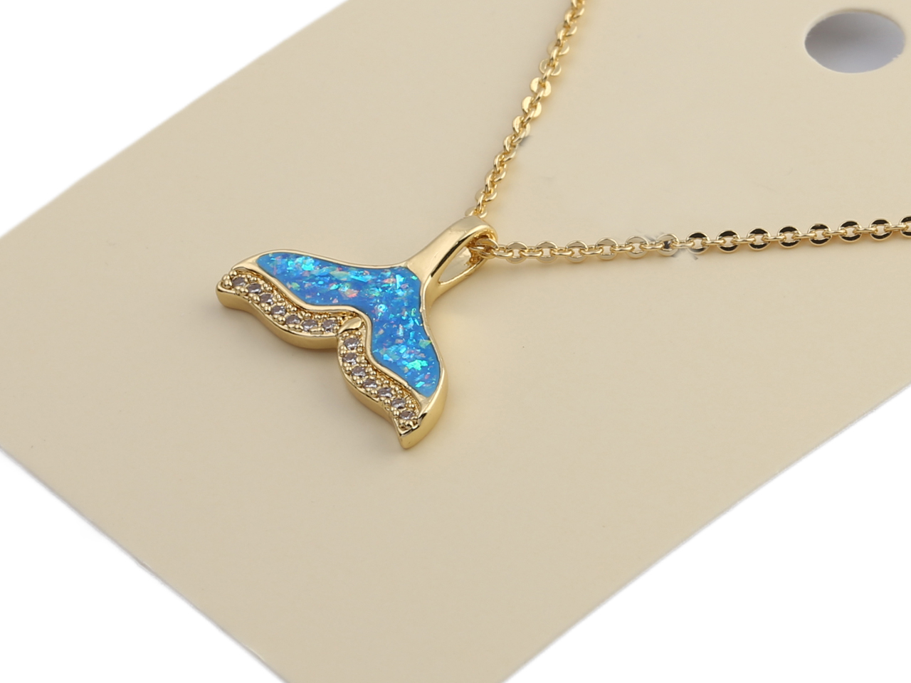 18x20mm Blue Synthetic Opal Whale Tail w/ CZ on 18″ Gold Tone Chain, MOQ-6