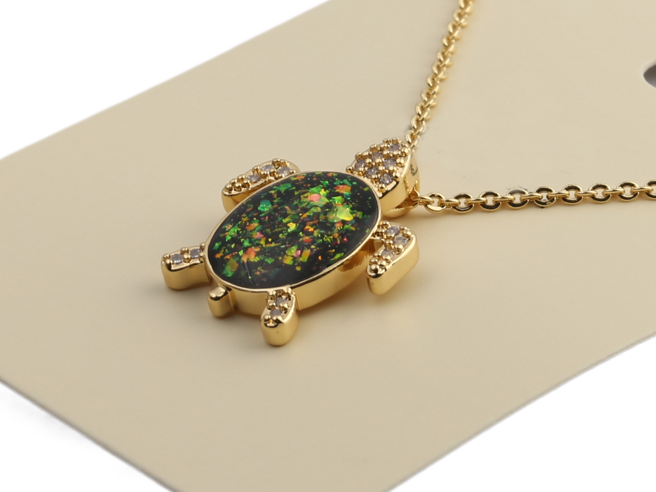 20x18mm Rainbow Synthetic Opal Turtle w/ CZ on 18″ Gold Tone Chain, MOQ-6