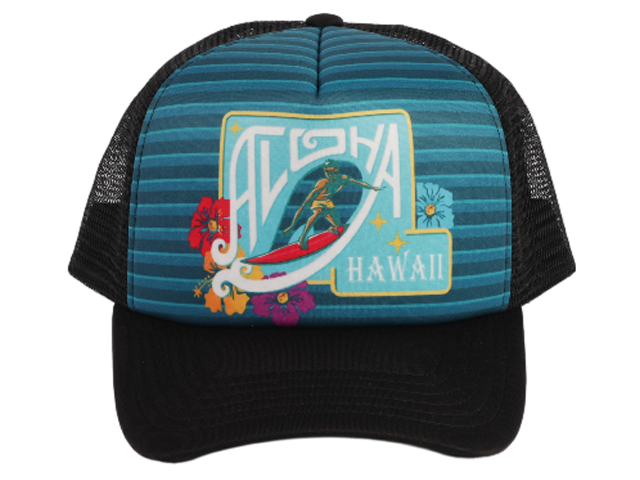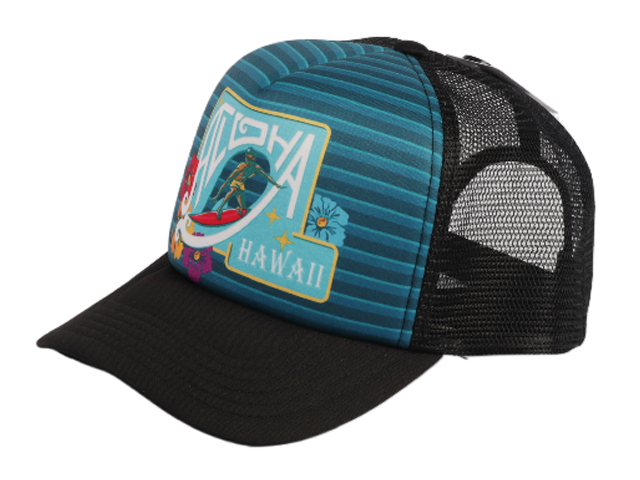 “Aloha, Hawaii” Surfer Color Printed Black Mesh Baseball Cap