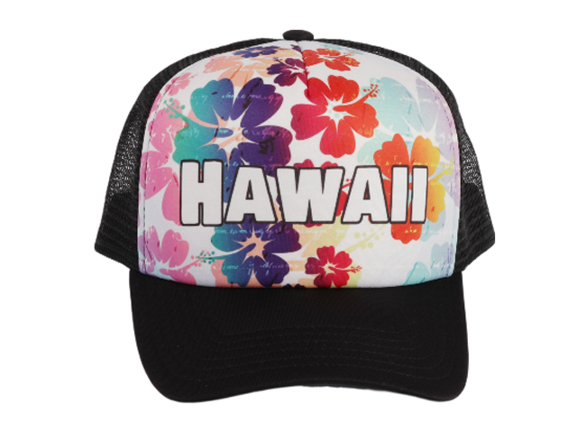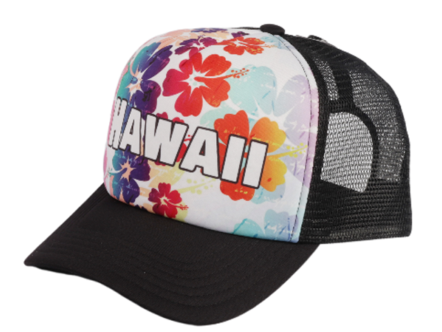 “Hawaii” Hibiscus Color Printed Black Mesh Baseball Cap