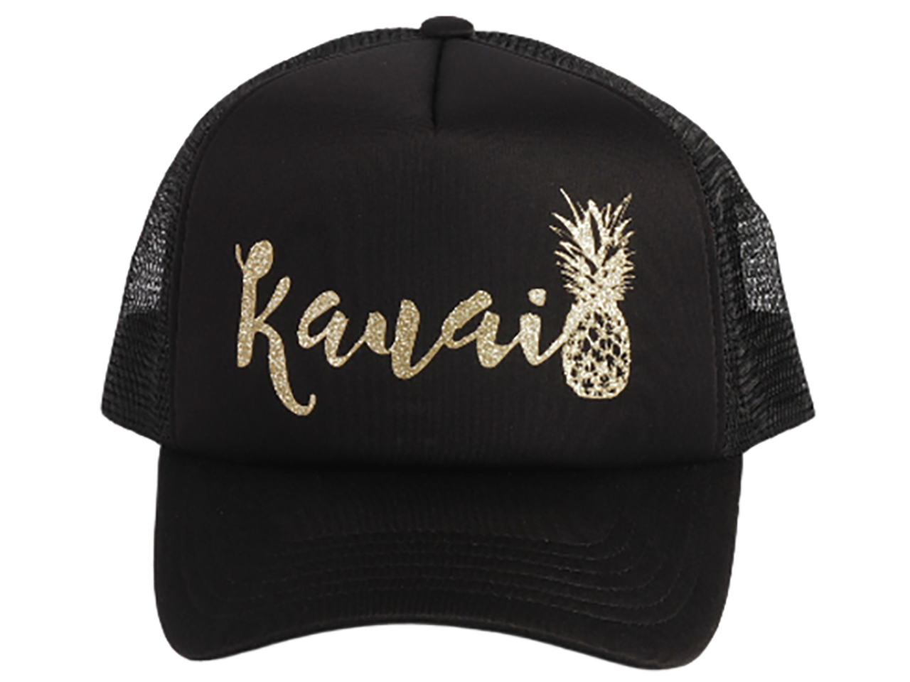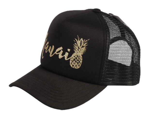 “Kauai” Pineapple Gold Print Black Mesh Baseball Cap