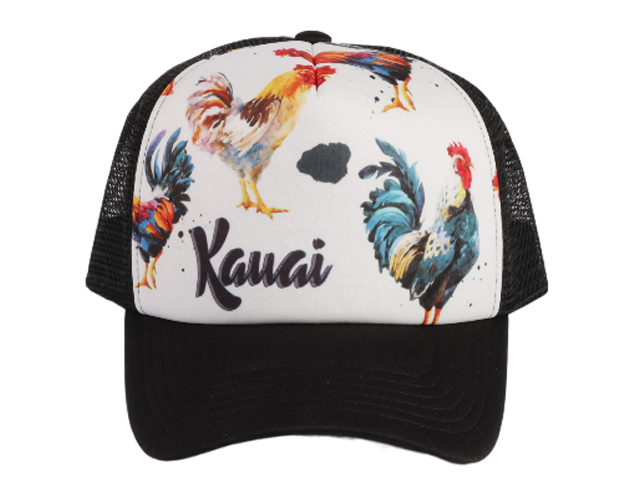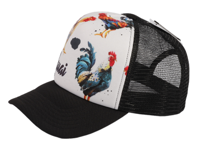 “Kauai” Rooster Color Printed Black Mesh Baseball Cap