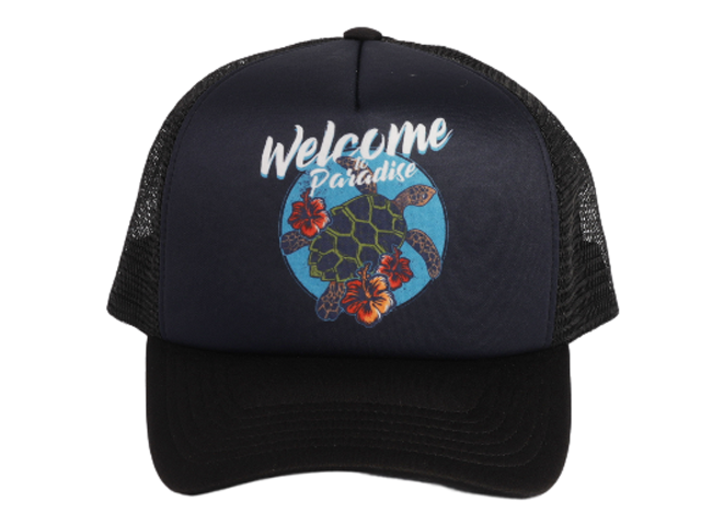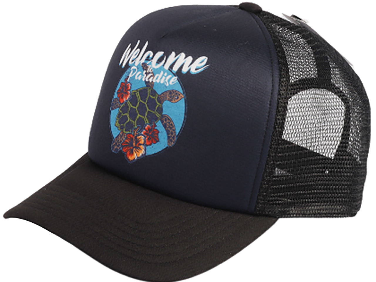“Welcome to Paradise” Turtle Color Printed Black Mesh Cap