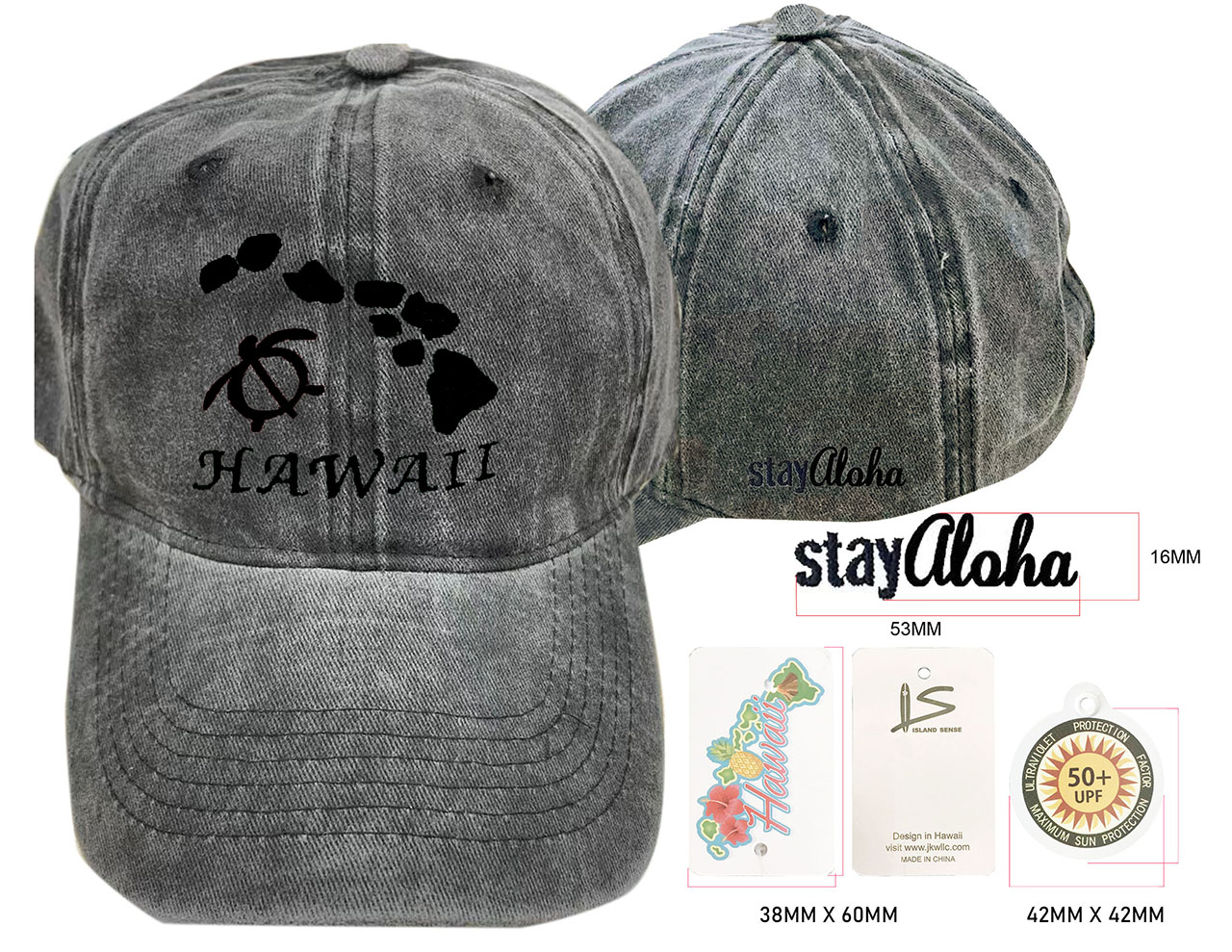 Hawaii Map & Turtle-Stay Aloha, Charcoal Cotton Cap, 6pcs/bag