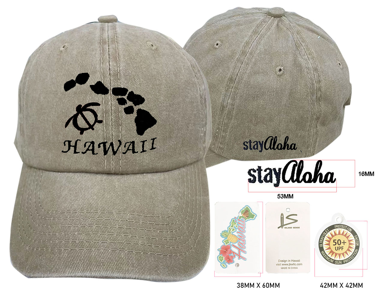 Hawaii Map & Turtle-Stay Aloha, Khaki Cotton Cap, 6pcs/bag