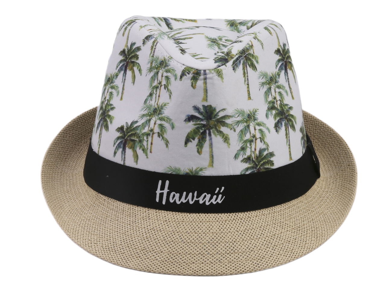 “Hawaii” Palm Tree Print Unisex Straw Trilby Hat, MOQ-6/pk