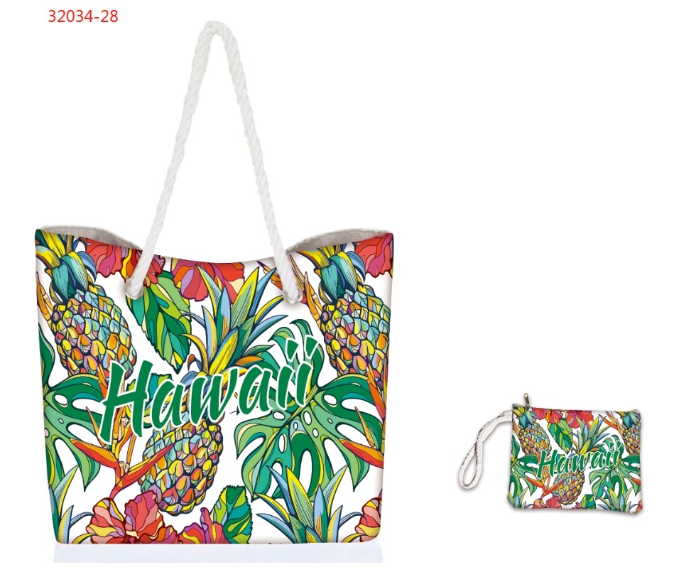 “Hawaii” Pineapple Print Polyester Cotton Tote Bag w/ Pouch and Zipper 17x12x4″, 25/Box, MOQ-4