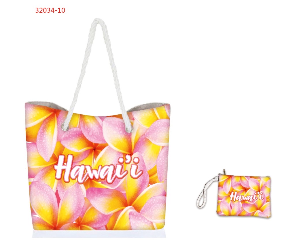 “Hawaii” Tropical Floral Beach Tote Bag w/ Pouch and Zipper 17x12x4″, 25/Box, MOQ-4