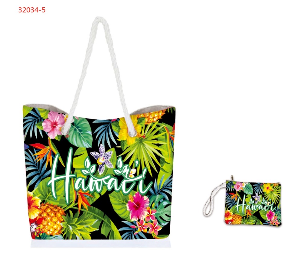 “Hawaii” Tropical Floral Beach Tote Bag w/ Small Pouch 17x12x4″, 25/Box, MOQ-4