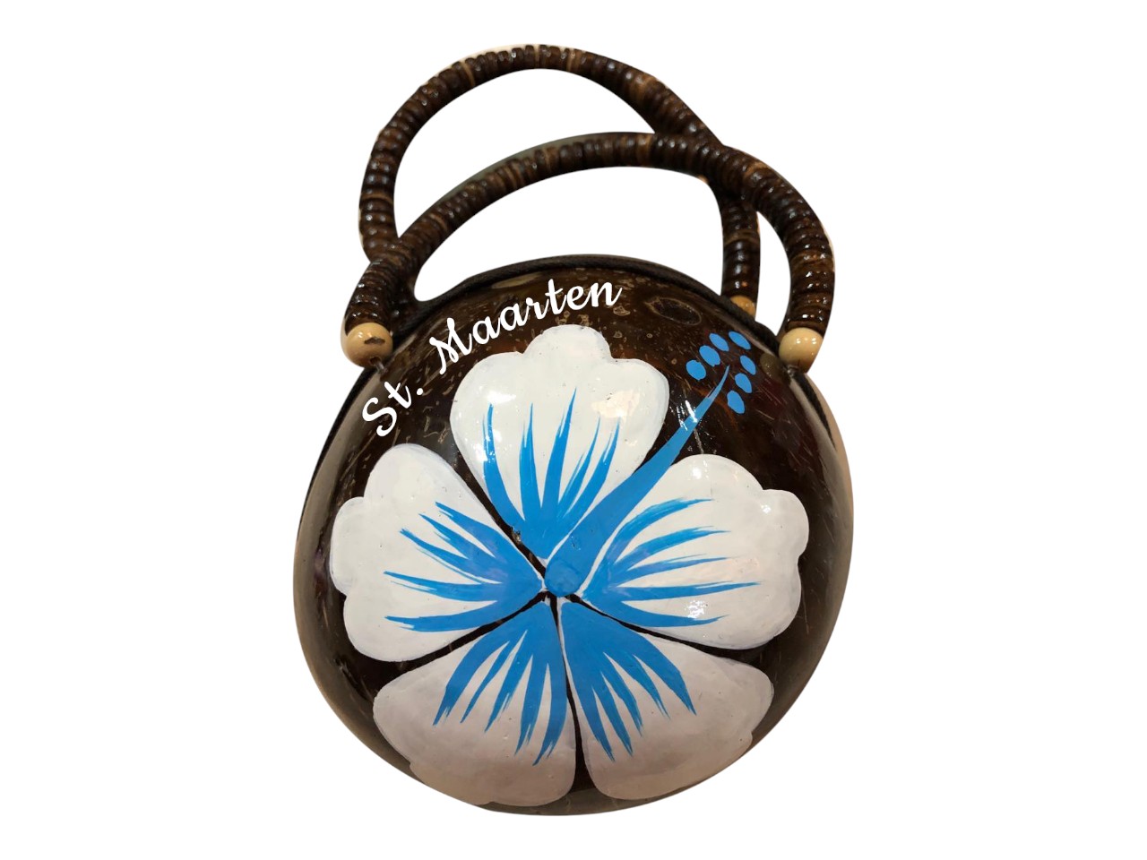 Coconut Bag Painted w/ White, Blue Hibiscus & Your “Location”