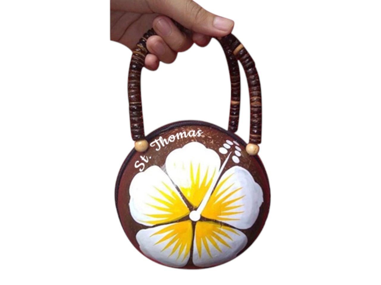 Coconut Bag Painted w/ White, Yellow Hibiscus & Your “Location”