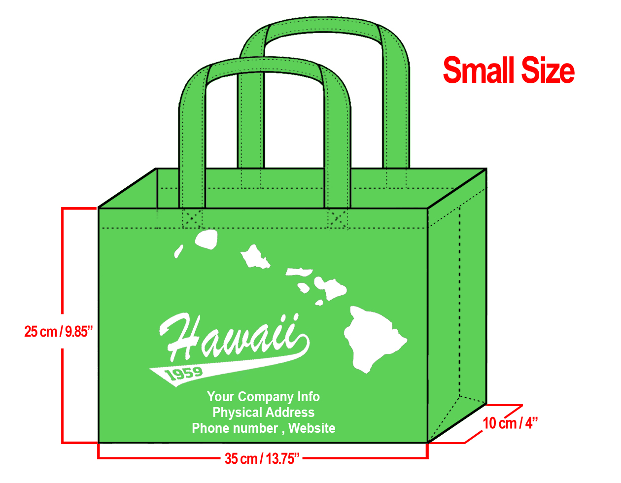 SMALL Green-25x35x10cm Hawaii Island Design & Your Info In White