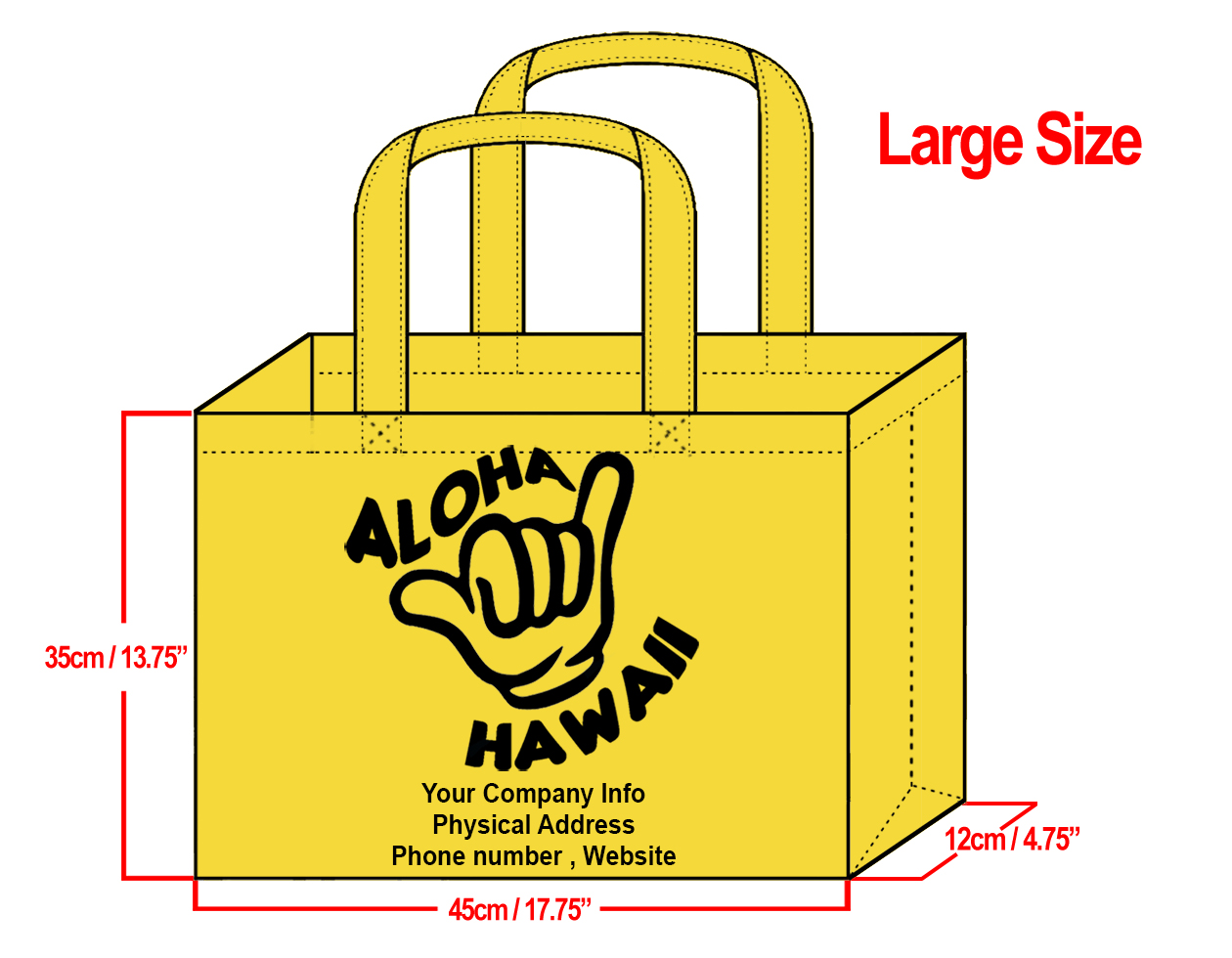 LARGE Yellow-35x45x12cm Shaka Design & Your Info In Black