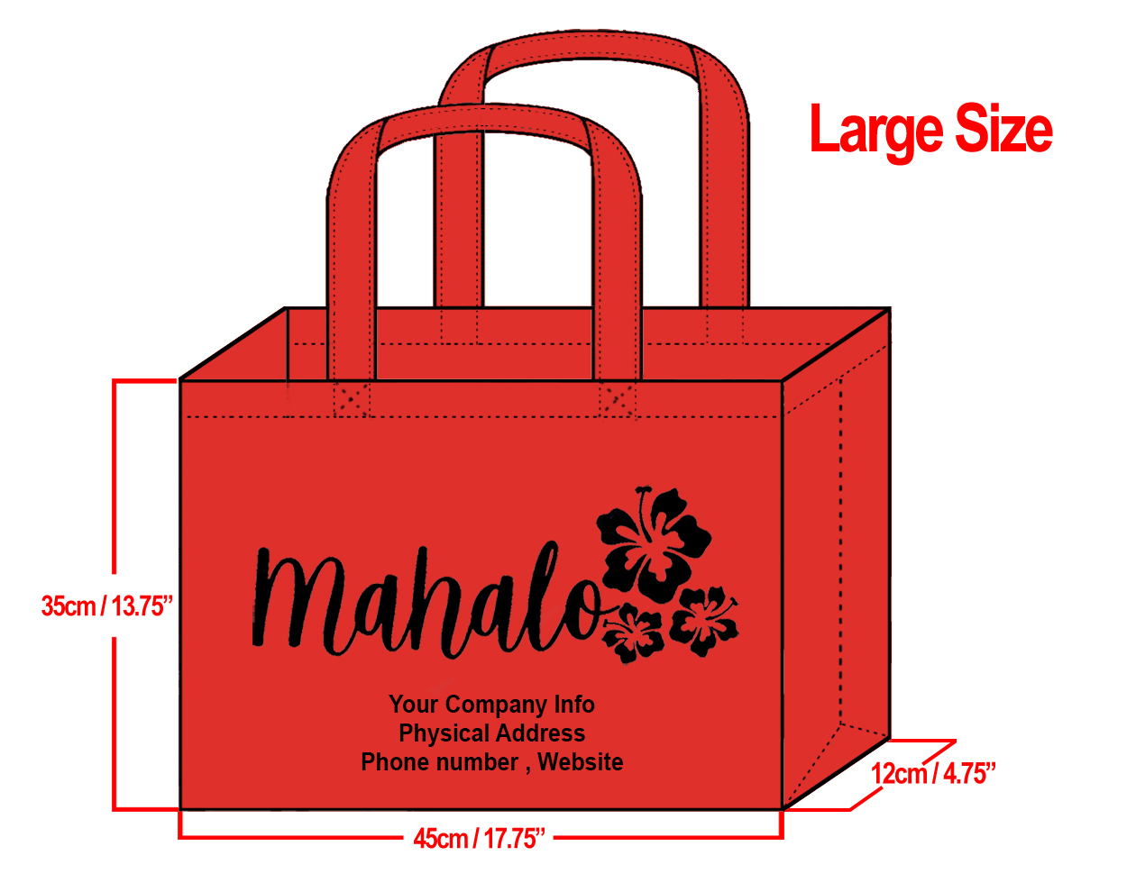 LARGE Red-35x45x12cm Mahalo Hibiscus Design & Your Info In Black