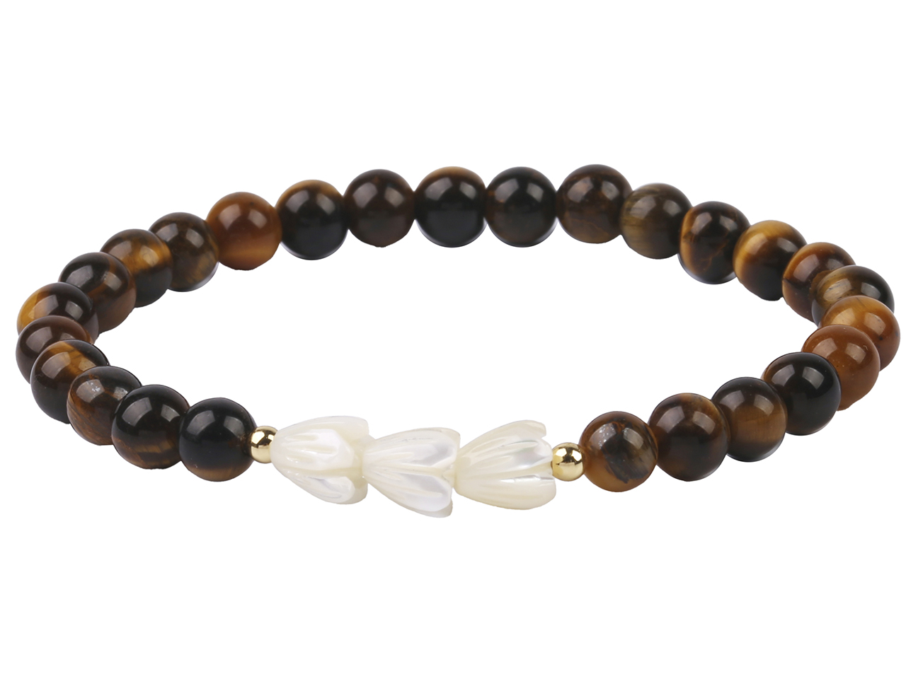 6mm Tiger Eye w/ MOP Shell Pikake Flower Elastic Bracelet, MOQ-6