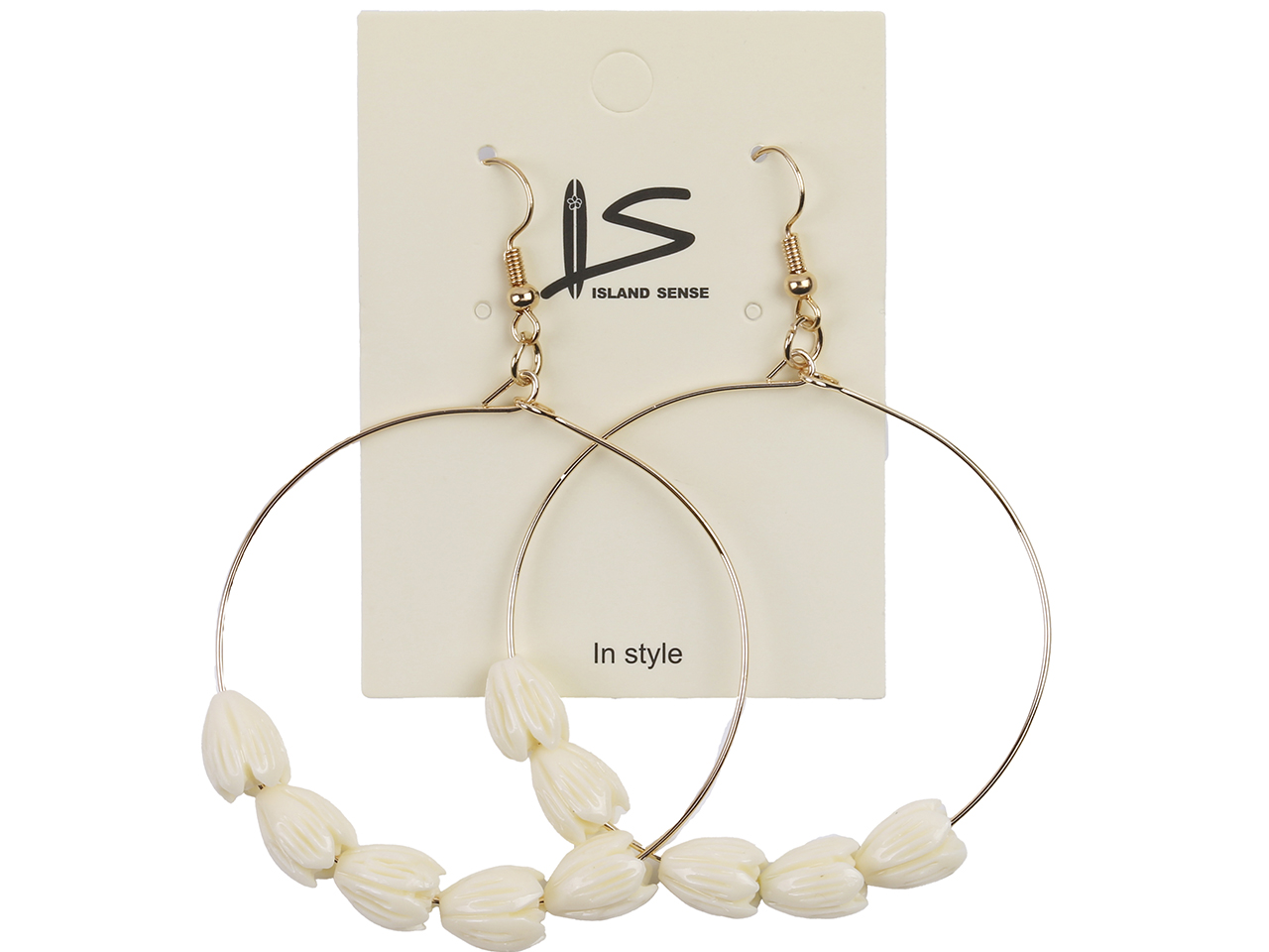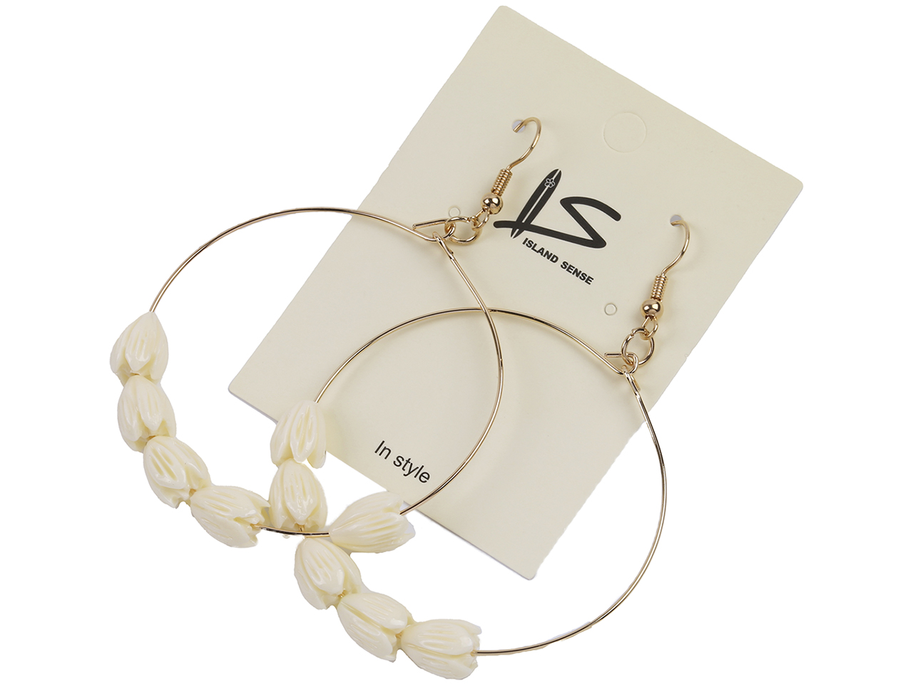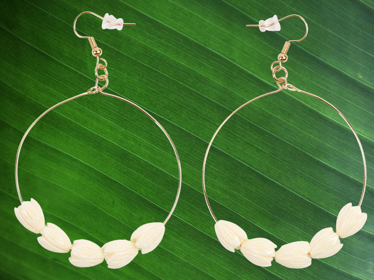 8x10mm Synthetic Pikake Flower Gold Tone Hoop Earrings, MOQ-6