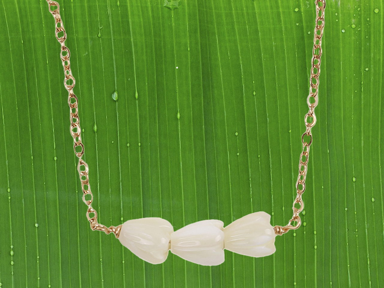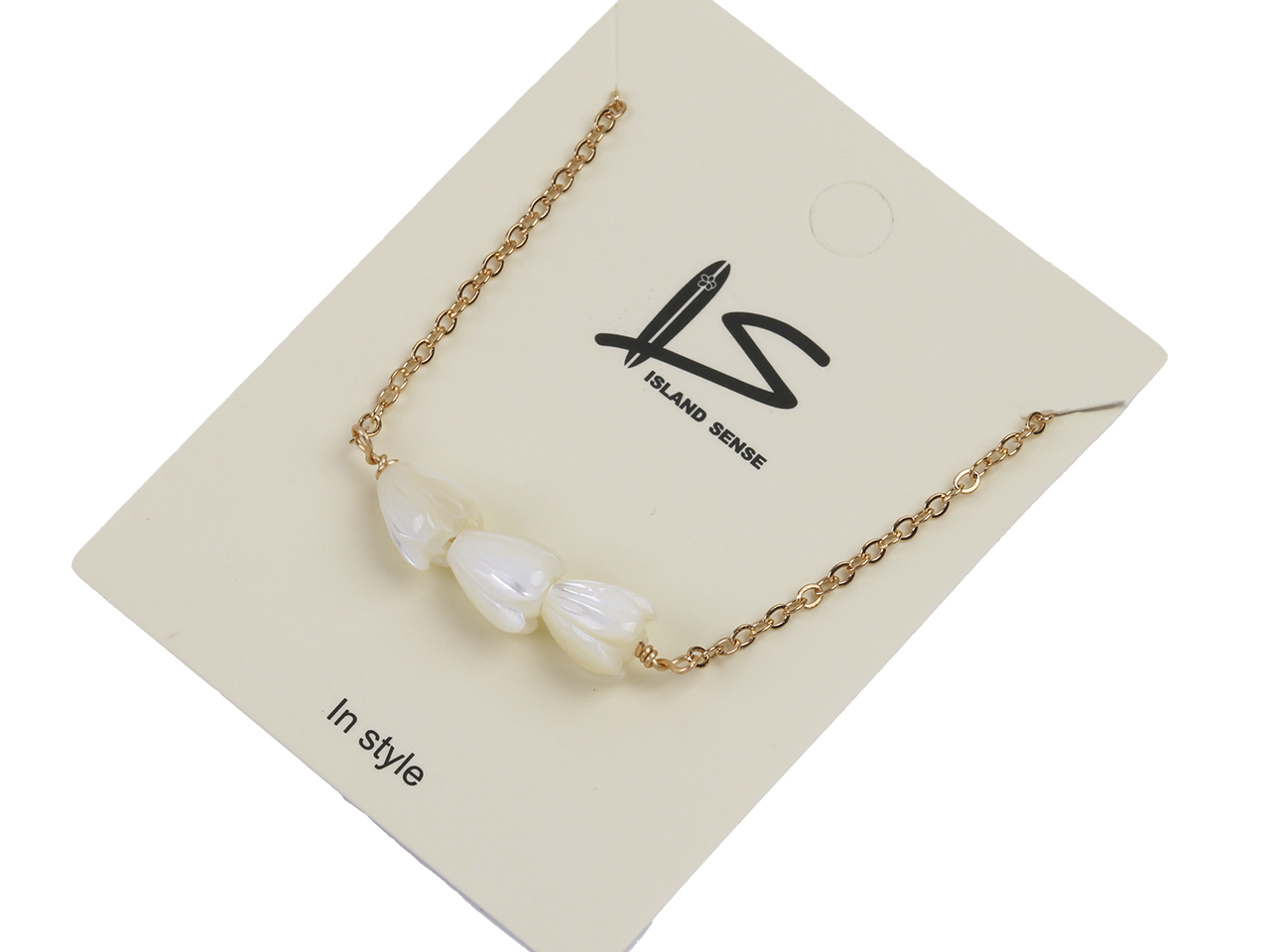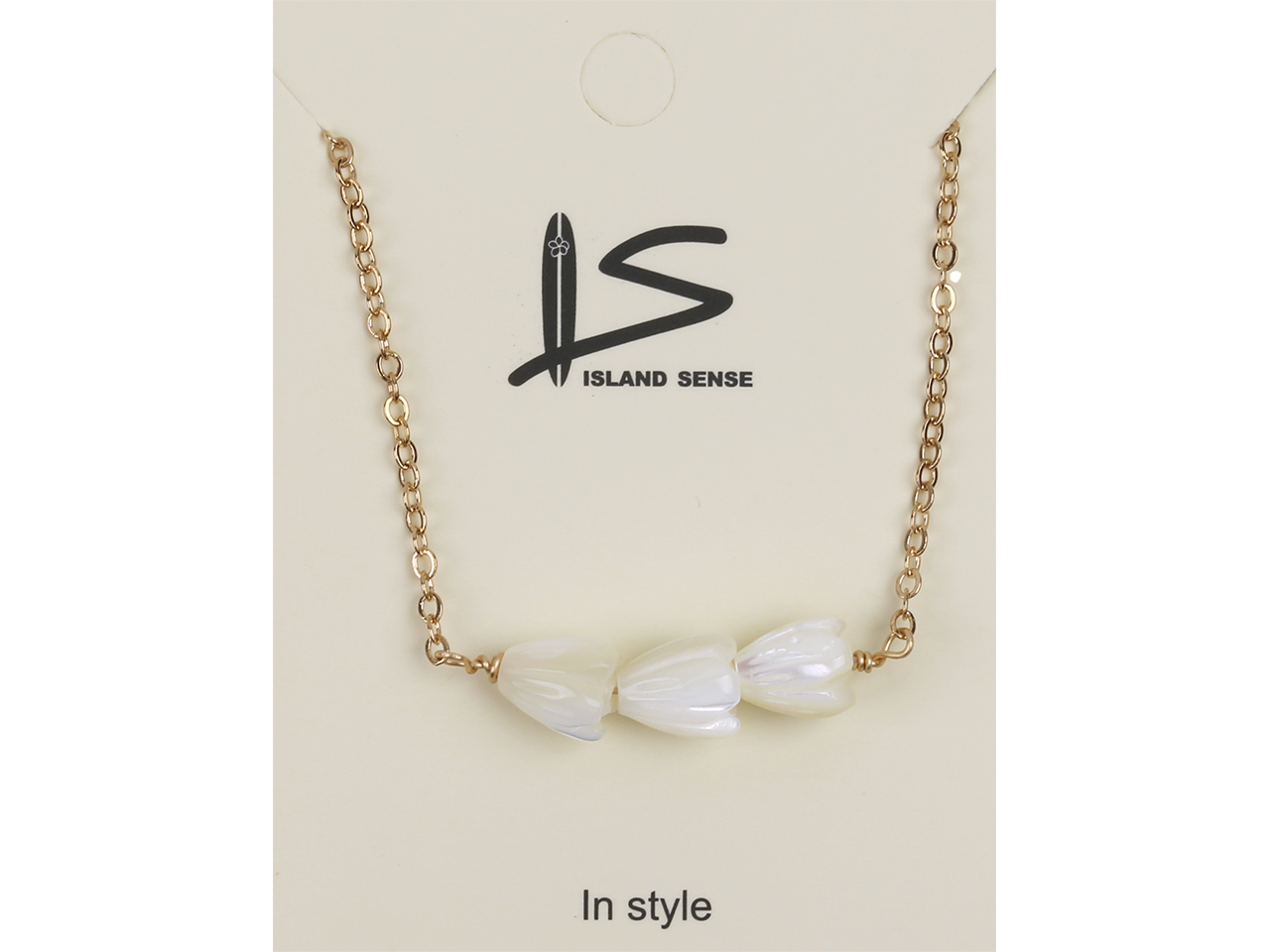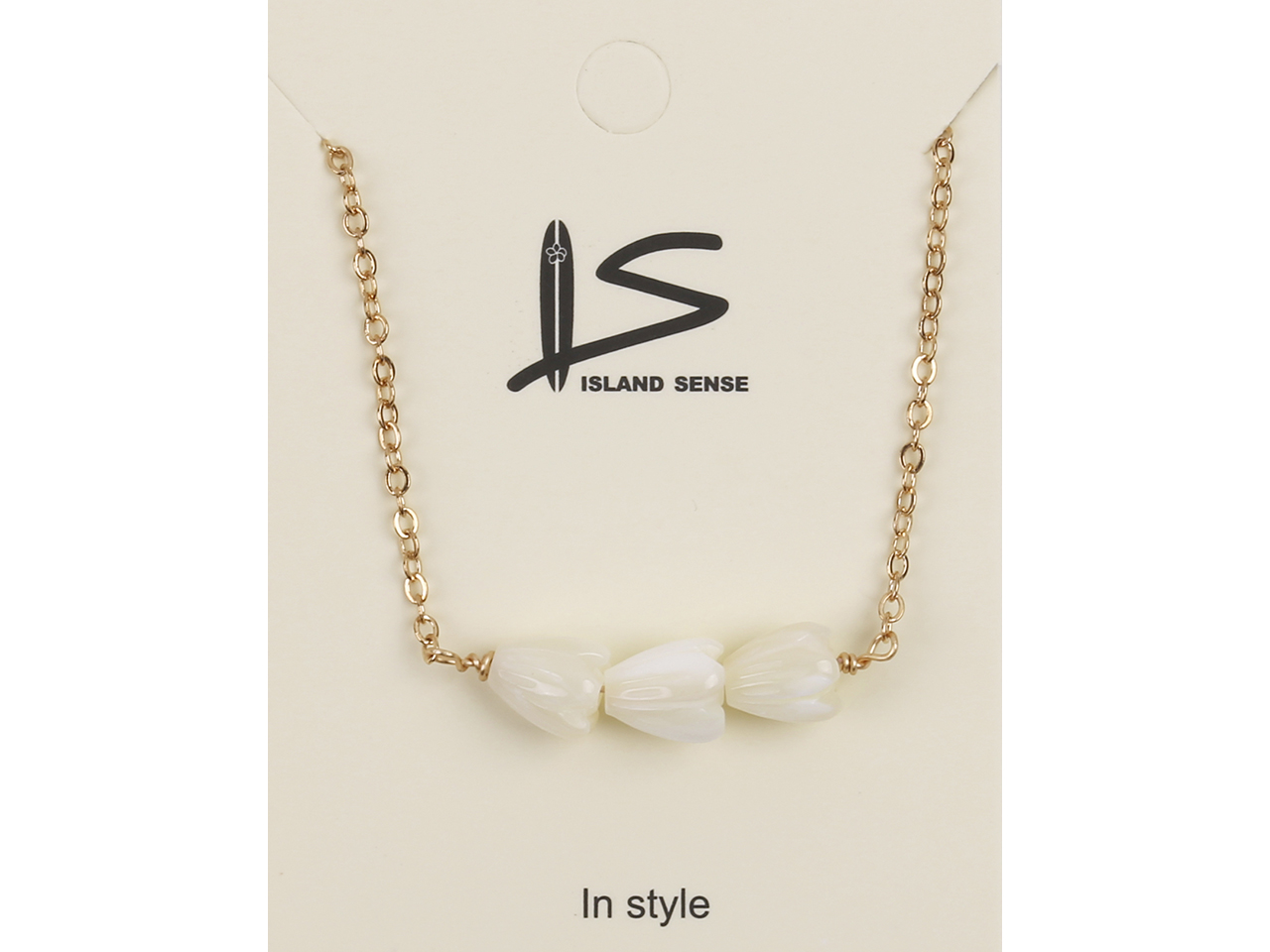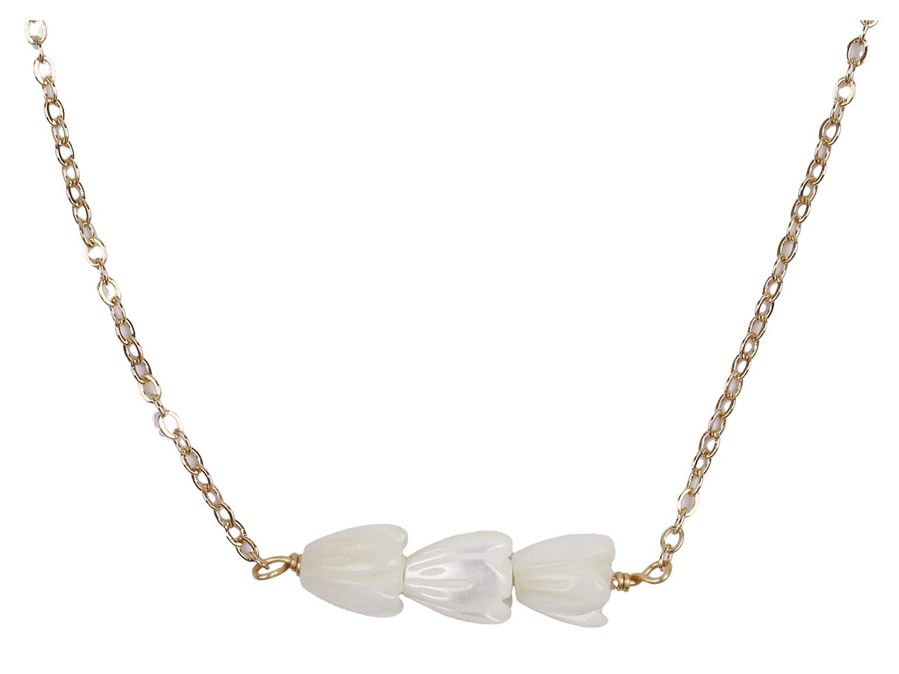 Triple 6x8mm MOP Pikake Flower on Gold Tone Chain Necklace, 16″+2″ Ext, MOQ-6