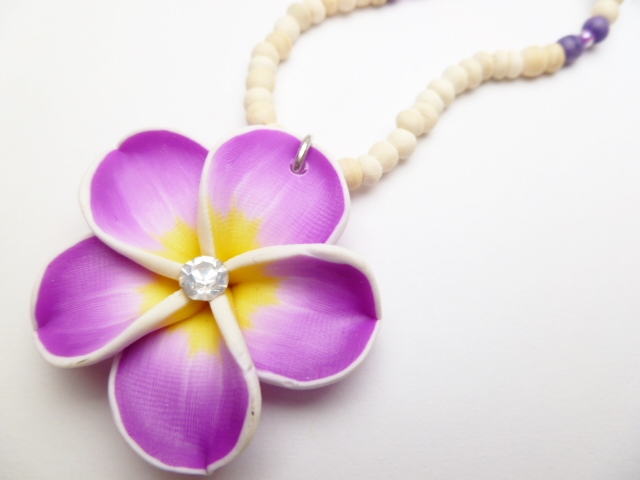 35mm Purple Fimo Flower w/ CZ on Natural Coco Bead Necklace (30237-17)