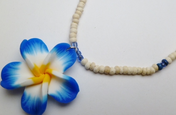 35mm Royal Blue Fimo Flower w/ Natural Coco Bead Necklace (30237-8)